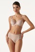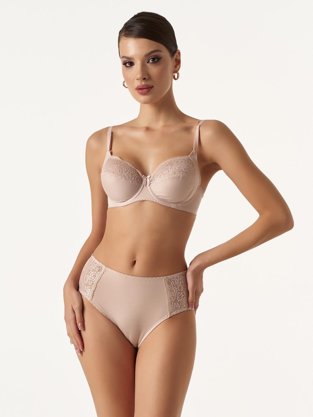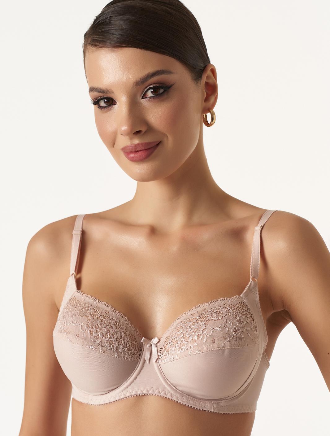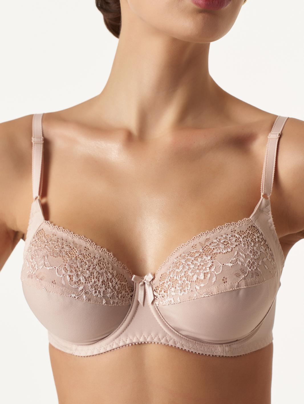 Бюстгальтер с мягкой чашкой, выполненный из эластичного трикотажного полотна и декорированный эластичным кружевом в верхней части чашки. Есть боковая поддерживающая деталь, обеспечивающая дополнительное приподнимание груди. В модели присутствуют каркасы (косточки). Бретели регулируются по длине. Ширина бретелей увеличивается пропорционально увеличению размера (1,0 см, 1,5 см, 2,0 см, 2,5 см). В самых маленьких размерах застежка на 1 крючок из двух позиций, в большинстве размеров застежка на 2 крючка из трех позиций; в больших размерах на 3 крючка с выбором из трех позиций.