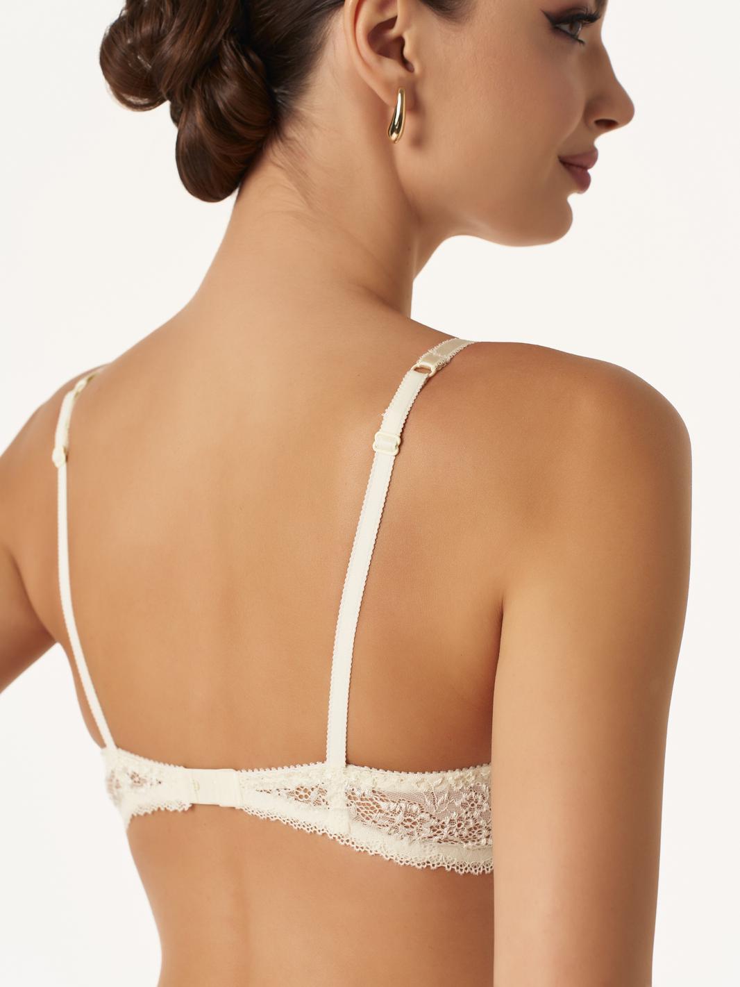 Кружевной бюстгальтер на подкладке из монокопрона. В конструкции присутствуют каркасы («косточки»). Бретели регулируются по длине.