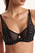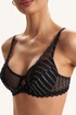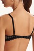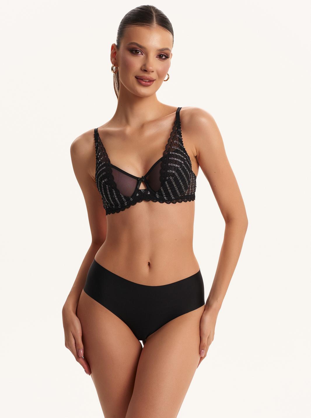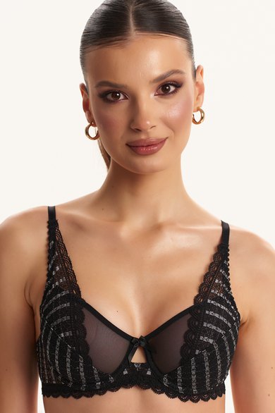 Бюстгальтер из кружева на подкладке из хлопка, декорированный тонкой эластичной сеткой. Чашки на каркасах («косточках»). Бочки кружевные. Бретели регулируются по длине, но не отстегиваются.