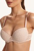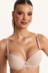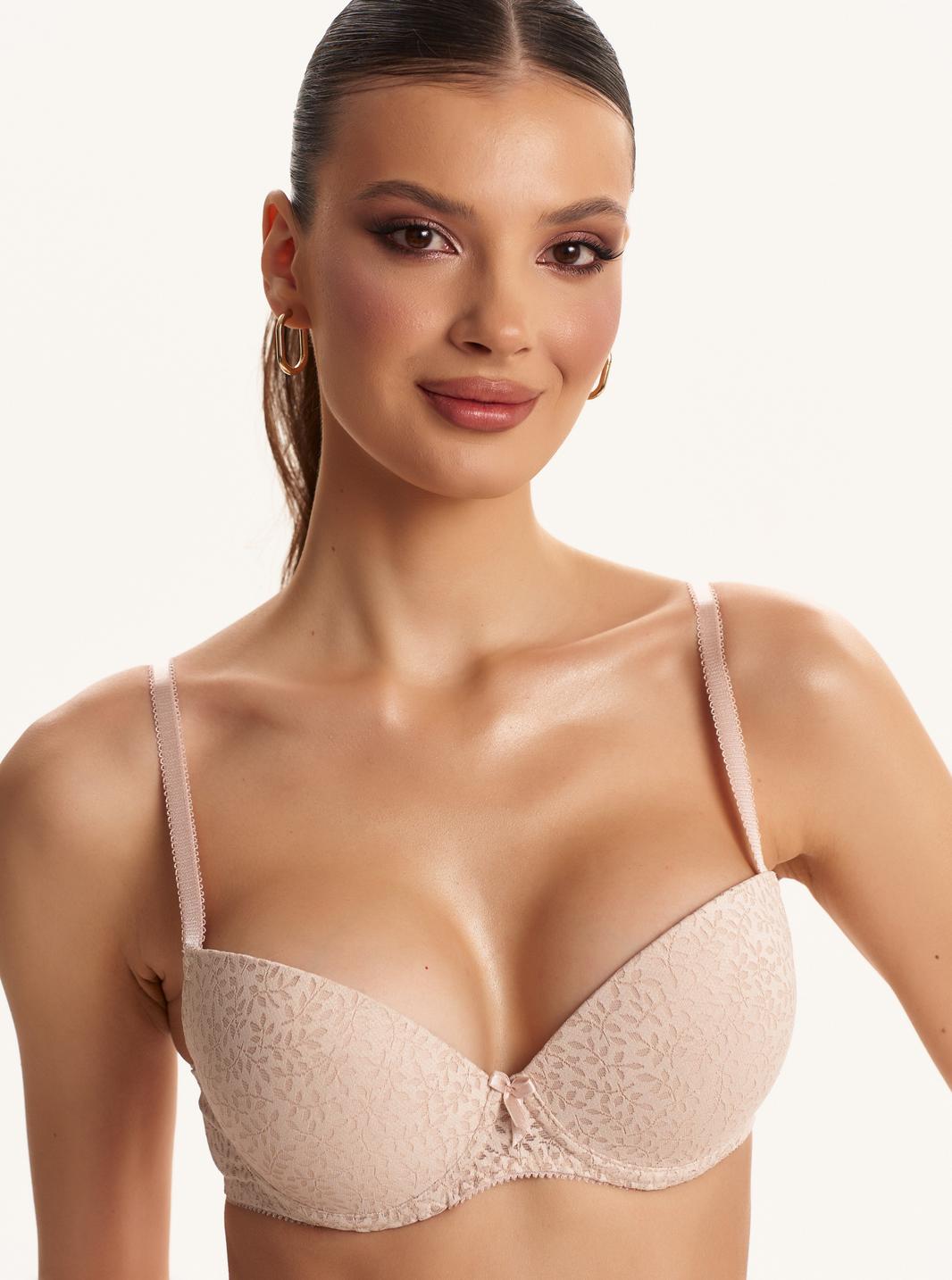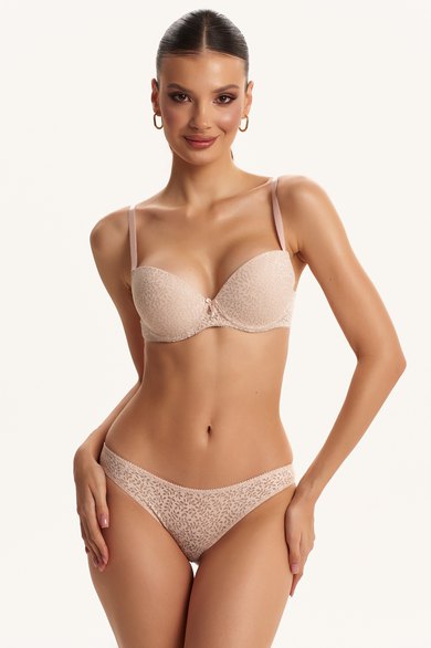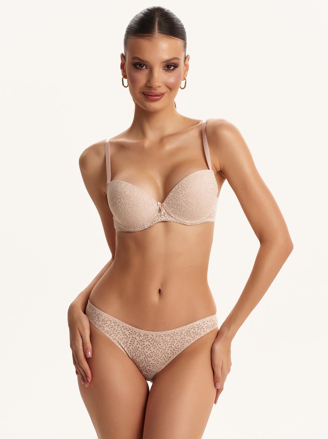 Бюстгальтер с формованной чашкой (эффект двойного «пуш-ап») на косточках, которые усиливают поддержку, приподнимая грудь, делая ее более полной и округлой. Выполнен полностью из эластичного трикотажного полотна. В качестве декоративного элемента присутствует маленький бантик спереди по центру изделия.