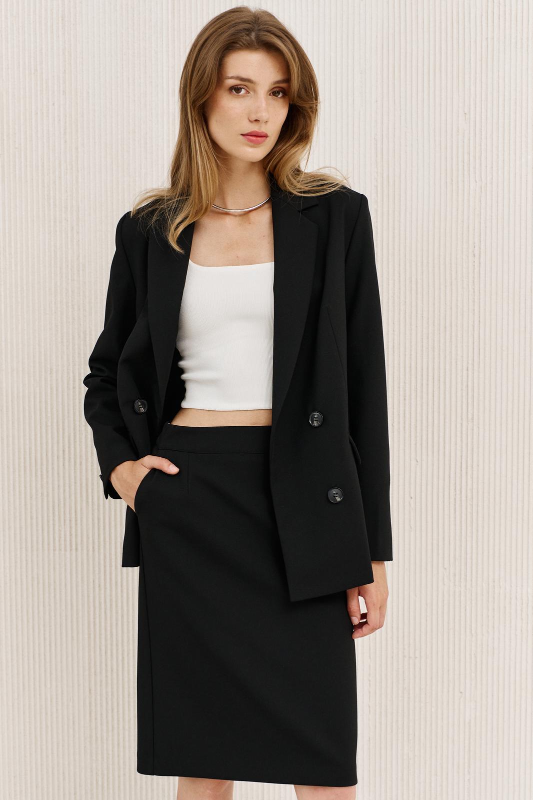 Юбка женская прямого силуэта притачном фигурном поясе и на подкладке. Застежка на потайную тесьму-молнию в заднем шве заднего полотнища и с разрезом. В боковых швах спроектированы карманы хулиганы.