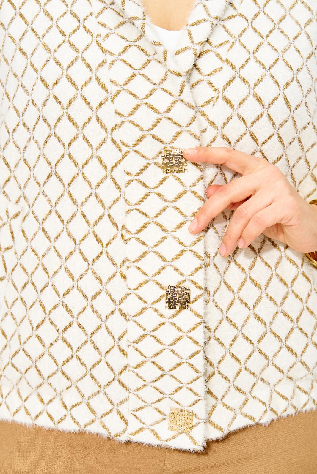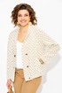 Трикотажный кардиган с эффектным принтом – отличный выбор для повседневной одежды в офис и для особого случая. Модель выполнена из мягкого материала, который приятно ощущается на теле. Укороченный фасон, присборен по низу на резинку, придает пикантность образу. Воротник отложной по типу шали. По полочке расположены прорезные карманы. Металлические пришивные кнопки служат не только функциональным элементом застежки, но и подчеркивают аккуратность изделия. Короткий кардиган оверсайз в стиле old money разработан с учетом особенностей: он хорошо сидит по фигуре, не стесняет движений. Отлично сочетается с базовыми брюками из коллекции от бренда «Лилиана». Длина по спинке – 58-60 см. Рукав – 62 см.