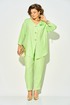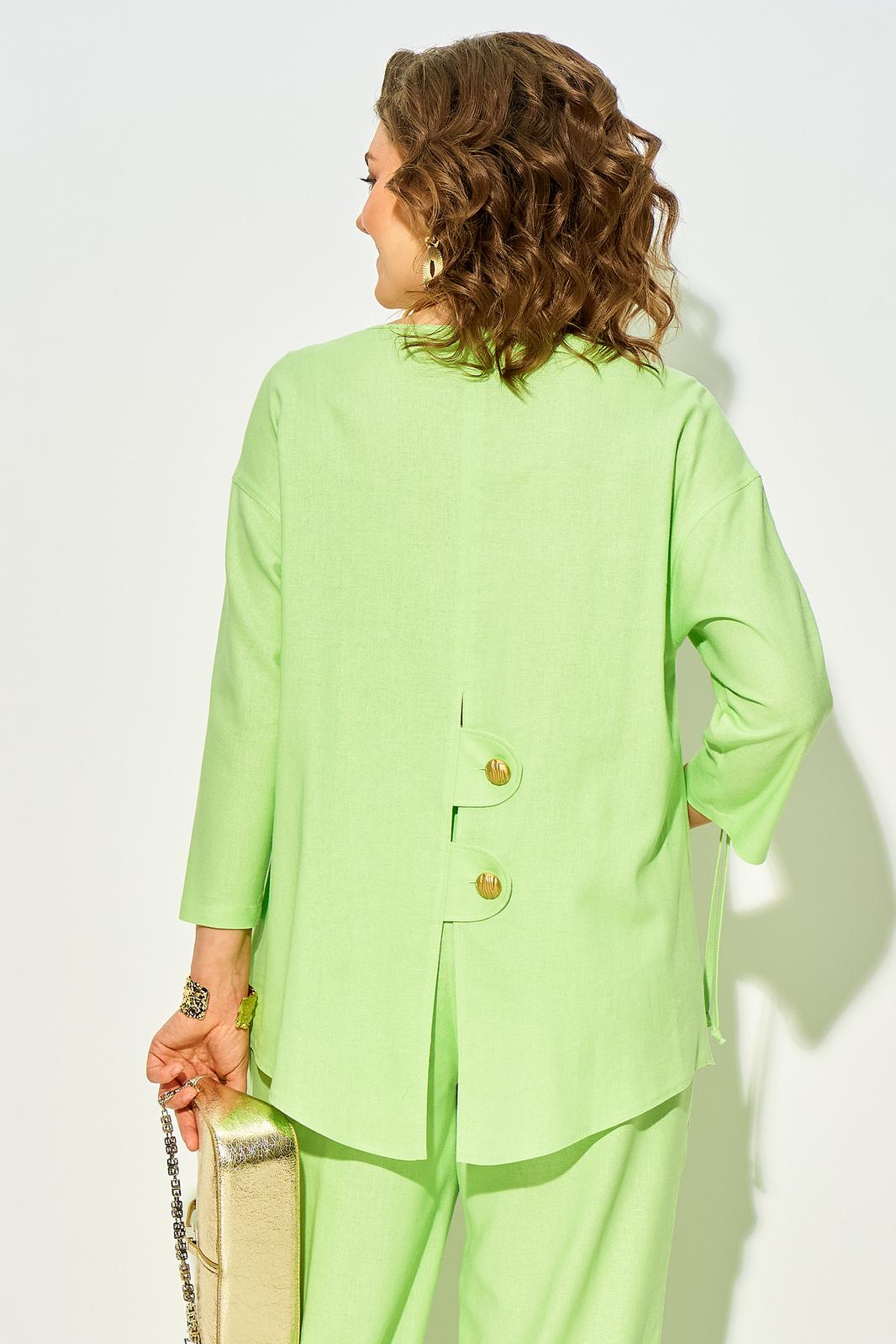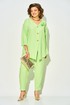 Эффектный летний костюм, из натурального льна с добавлением вискозы; состоит из свободной блузки и брюк. Блузка свободного силуэта, со спущенной линией плеча и рукавом длиной ¾-ти. Модель c V-образной линией горловины с центральной застежкой на петли и пуговицы. По центру рукава расположена кулиска с утяжкой на шнуровку. Спинка с центральным швом, переходящий в шлицу с декоративными клапанами на пуговицах. Брюки в костюме с завышенной посадкой, на притачном поясе с круговой резинкой. По бокам имеются рабочие карманы. Низ брюк с заложенными складками. Отличный вариант на жаркую солнечную погоду; для особого случая и легкого променада!