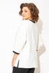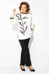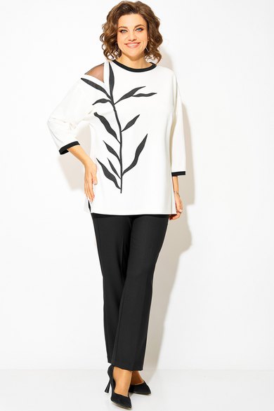 Нарядная блузка-туника больших размеров, выполнена из трикотажного джерси. Модель прямого силуэта, со спущенной линией плеча и рукавом длиной ¾-ти. Модель с округлым вырезом горловины на мягкой притачной планке контрастного цвета. По бокам предусмотрены разрезы на свободу. Полочка декорирована печатью накатом с мерцающим эффектом в виде ветви. На плече ассиметричная вставка из сетки. Брюки в комплекте прямого фасона, средней посадки. Пояс притачной, в боковых участках вставлена резинка. Застежка – брючная тесьма-молния с обработанным гульфиком. По переду заутюжены канты. Брюки с боковыми карманами.