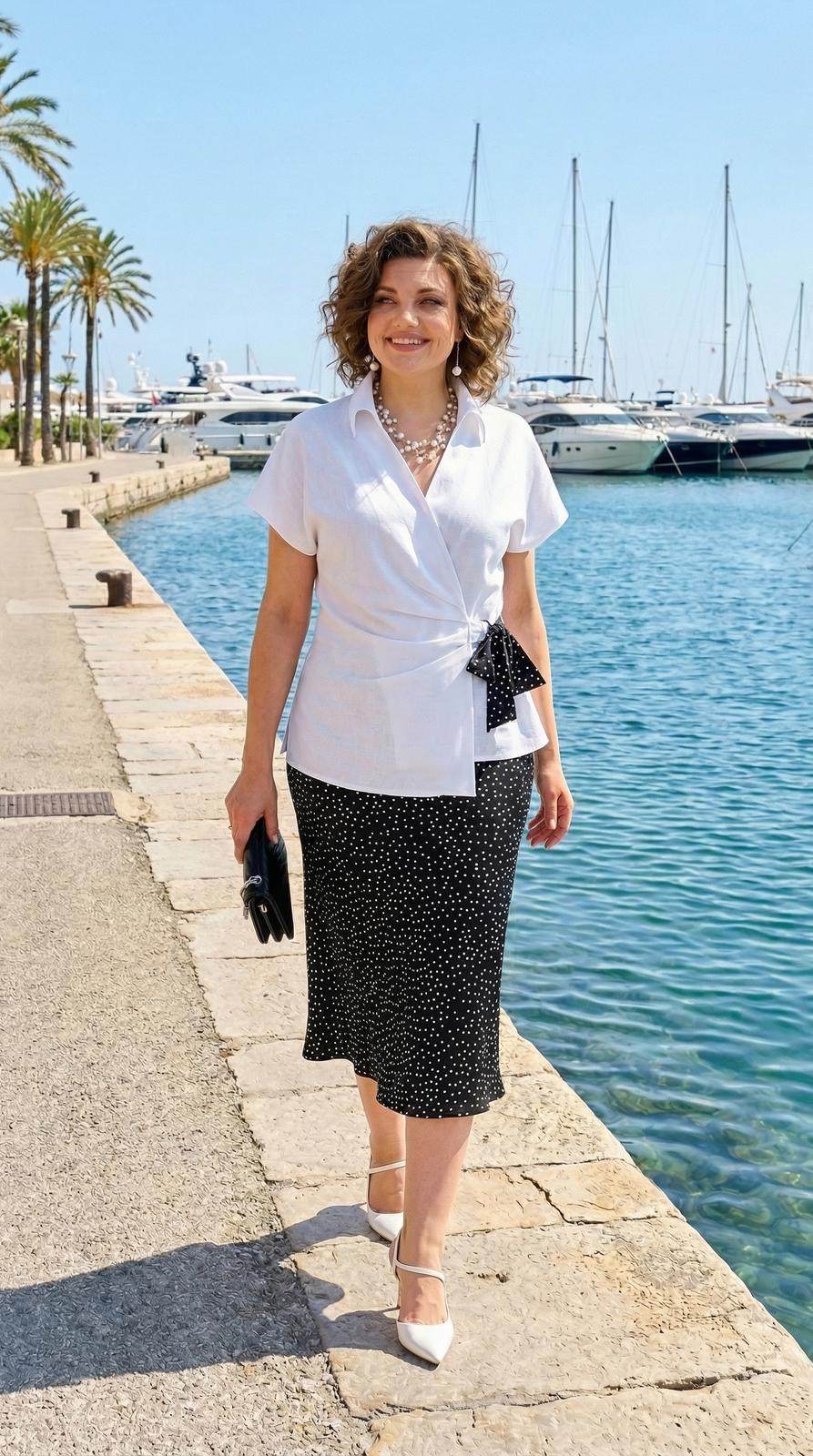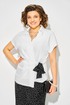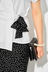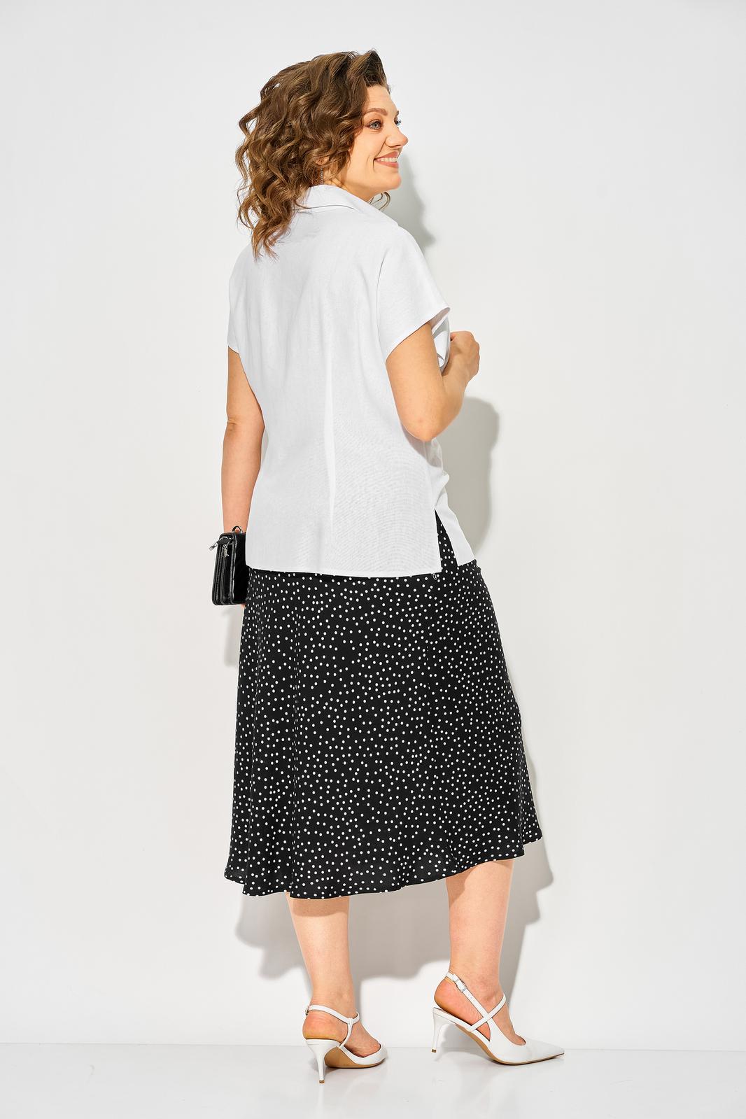 Стильный костюм состоящий из эффектной блузки и юбки из штапеля в трендовый горох создана специально для plus size-фигур, сочетая лёгкость, комфорт и идеальную посадку. Крой юбки по-косой обеспечивает мягкое прилегание, красиво струится при движении и визуально вытягивает силуэт. Модель на цельнокроеном поясе с резинкой. Блузка полуприталенного силуэта на запах, с v-образным вырезом горловины и отложным воротником на стойке. Рукав цельнокроеный, спущенный. Ассиметричные складки, переходящие в драпировку в области талии, скрывают все недостатки, подчеркивая ваши достоинства. Спинка прямая, с талиевыми выточками; по бокам предусмотрены разрезы. Изюминкой данной модели служит ассиметричная завязка на съемный платок на 2 полукольца.