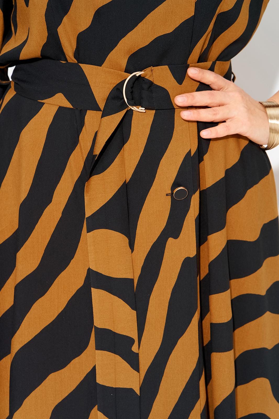 Стильное и элегантное платье с боковыми карманами подойдет для любого повода - от офисных встреч до праздничных торжеств. Английский отложной воротник переходит в двубортную застежку на декоративные пуговицы. По талии платье отрезное, юбка расклешена к низу. По спинке в области талии вставлена резинка для комфортного прилегания. Рукав вточной, длиной ¾-ти, у оката предусмотрена легкая сборка. В комплекте съемный пояс с пряжкой из основной ткани. Благодаря его универсальному дизайну прекрасно подчеркнет вашу фигуру и придаст ей изысканный образ. Подходит для высоких. Вырез на груди добавляет женственности и акцентирует внимание на декольте. В нем вы будете выглядеть нарядно и привлекать восхищенные взгляды окружающих.