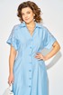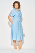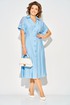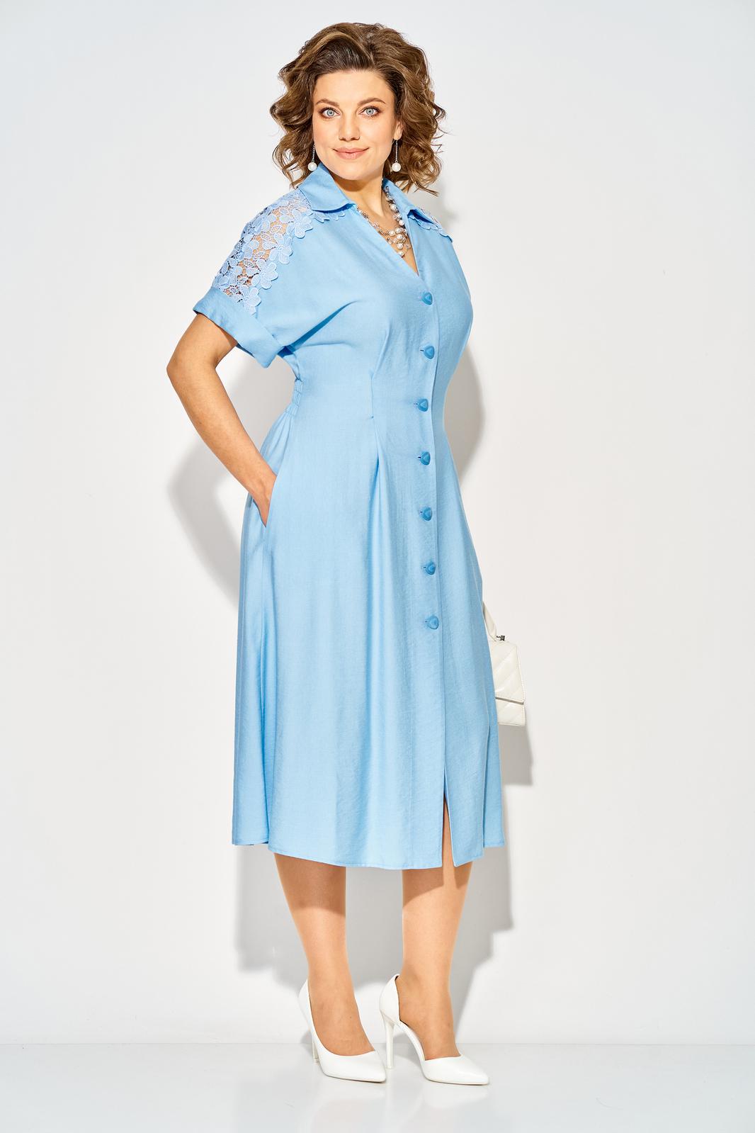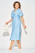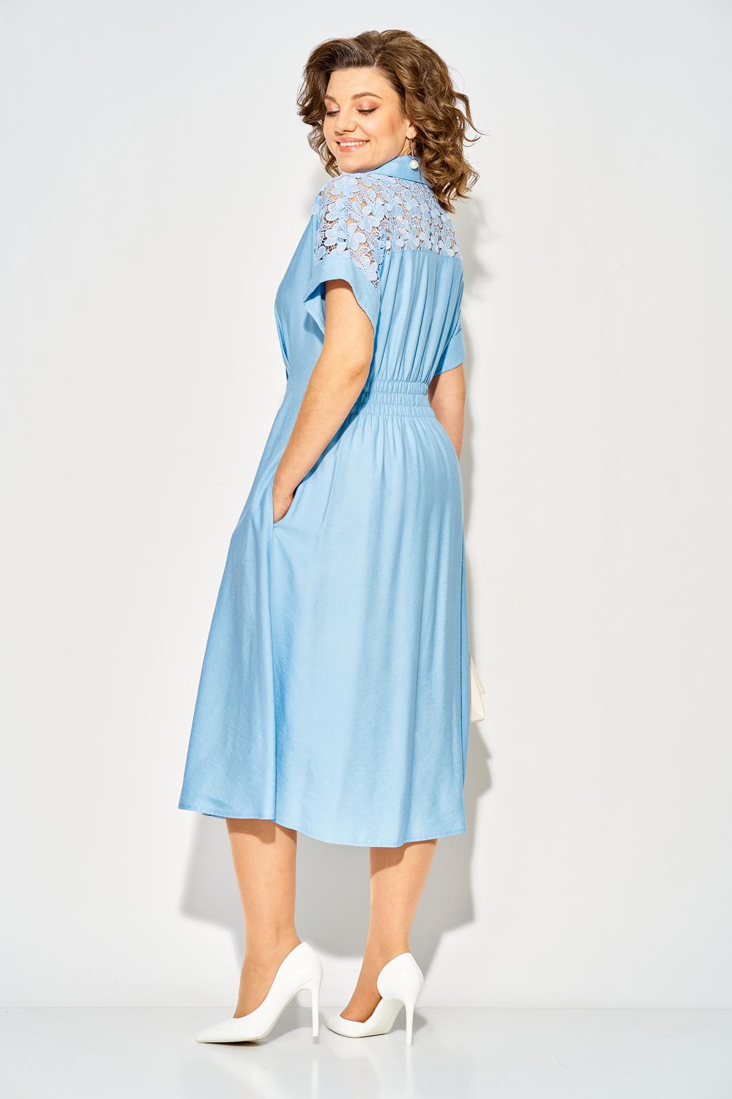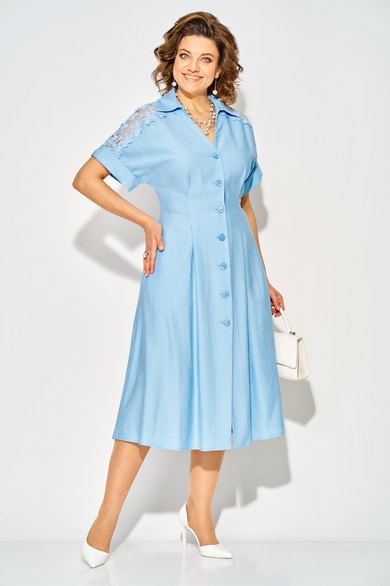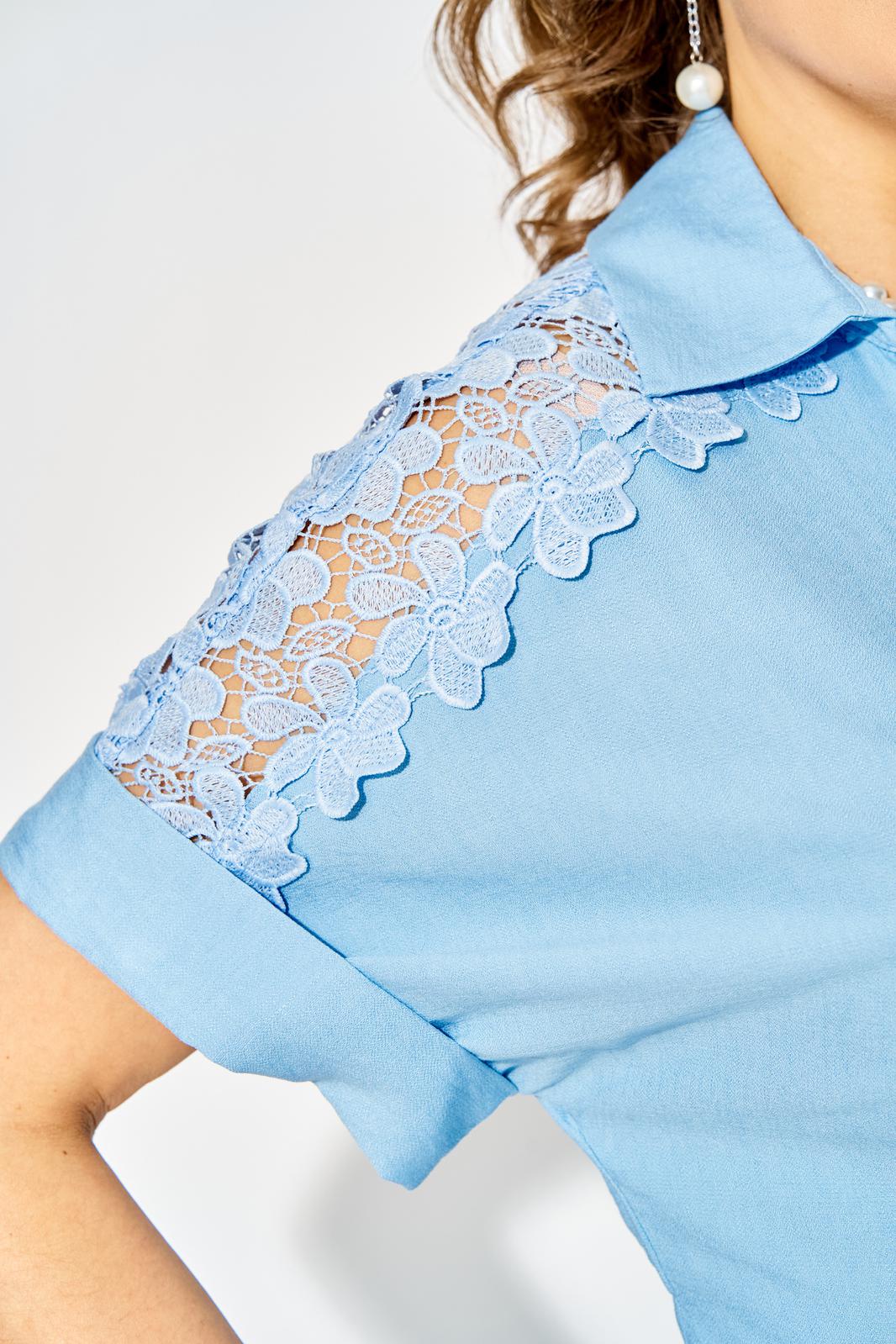 Эффектное весеннее летнее нарядное женское платье, выполнено из вискозного полотна со вставками из хлопкового кружева. Модель полуприталенного силуэта, с цельнокроеным спущенным рукавом и притачным манжетам по низу. Линия кокетки, переходящая на спинку оформлена вставкой из декоративного кружева. V-образный вырез горловины оформплен небольшим отложным воротником. Застежка – центральная на петли и пуговицы. По талии заложены декоративные складки. Спинка в области талии присборена на резинку, что обеспечивает более комфортное прилегание.