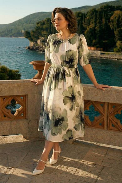 Женское платье длиной миди - выбор для девушек, которые хотят стильный и красивый образ на любое торжество. Это нарядное изделие подчеркнет индивидуальность и добавит легкое настроение весны и лета в ваш гардероб. Модель платья отрезное по талии с округлым вырезом горловины. По линии лифа и талии выточки перенесены в легкую сборку. Юбка в модели расклешена к низу. Рукав вточной, укороченный со сборкой по окату и низу рукава на эластичную резинку. Спинка с центральным швом и застежкой на навесную петлю с пуговкой. Юбка на подкладке.
