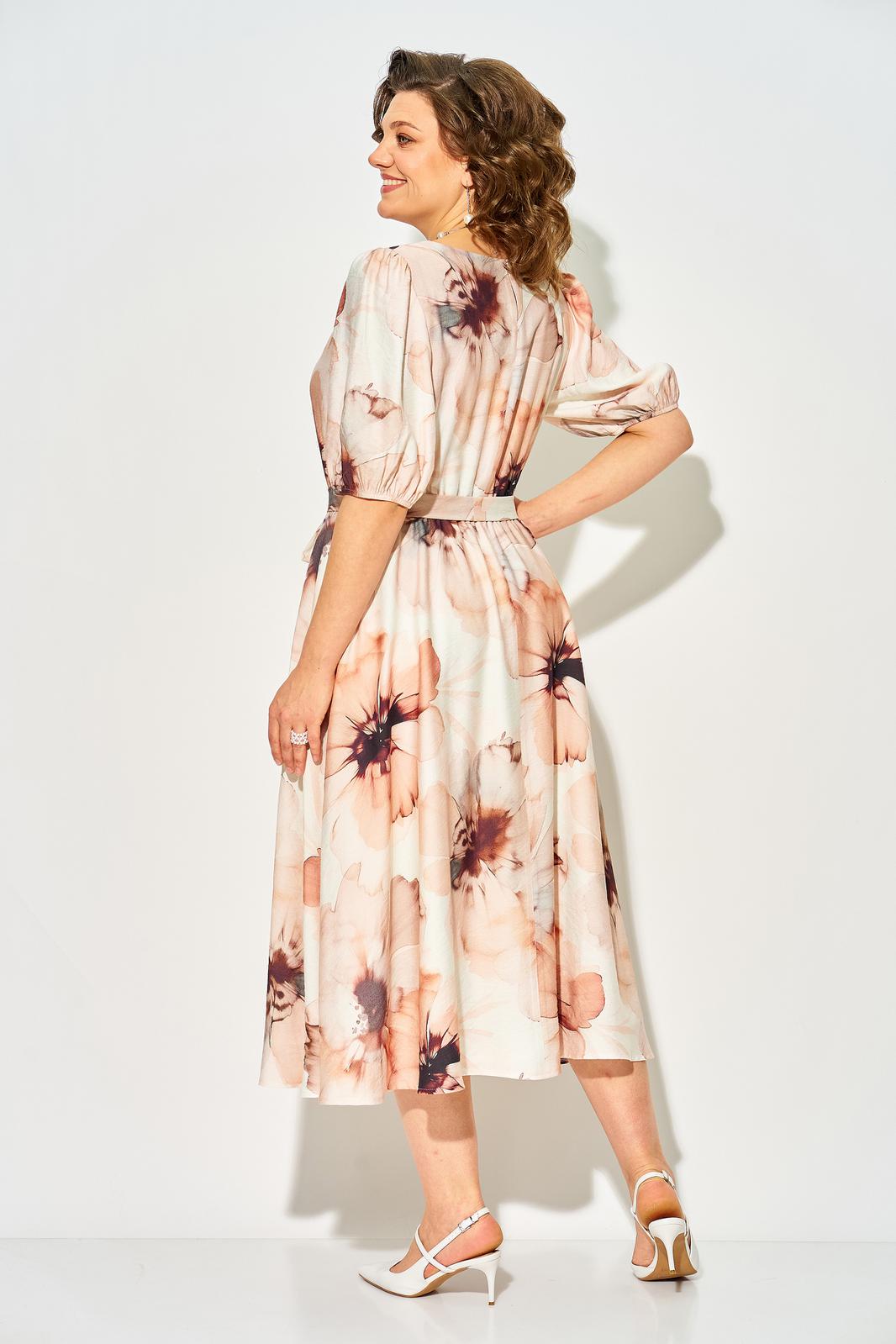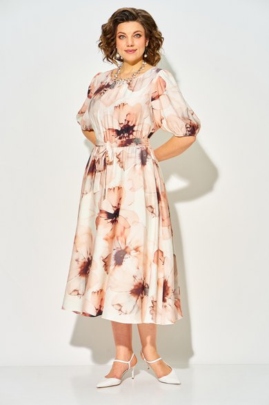Женское платье длиной миди - выбор для девушек, которые хотят стильный и красивый образ на любое торжество. Это нарядное изделие подчеркнет индивидуальность и добавит легкое настроение весны и лета в ваш гардероб. Модель платья отрезное по талии с округлым вырезом горловины. По линии лифа и талии выточки перенесены в легкую сборку. Юбка в модели расклешена к низу. Рукав вточной, укороченный со сборкой по окату и низу рукава на эластичную резинку. Спинка с центральным швом и застежкой на навесную петлю с пуговкой. Юбка на подкладке.