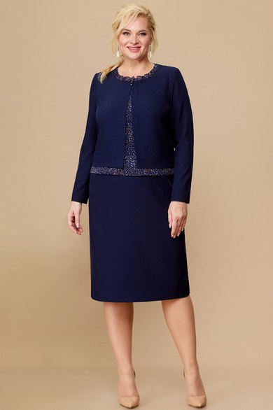Женское текстильное повседневное платье на рост 164см. Платье выполнено в виде имитации тройки: жакета, блузки из шифона с принтом и юбки. Силуэт платья полуприлегающий, спереди нагрудные вытачки из проймы, по спинке средний шов и плечевые вытачки. В среднем шве обработана застежка-молния и шлица. Рукав втачной длинный. Вырез горловины круглый с рюшей из шифона. Длина спинки 108,5см. ПОГ: 54р-56см, 56р-58см, 58р-60см. ПОБ: 54р-60см, 56р-62см, 58р-64см.