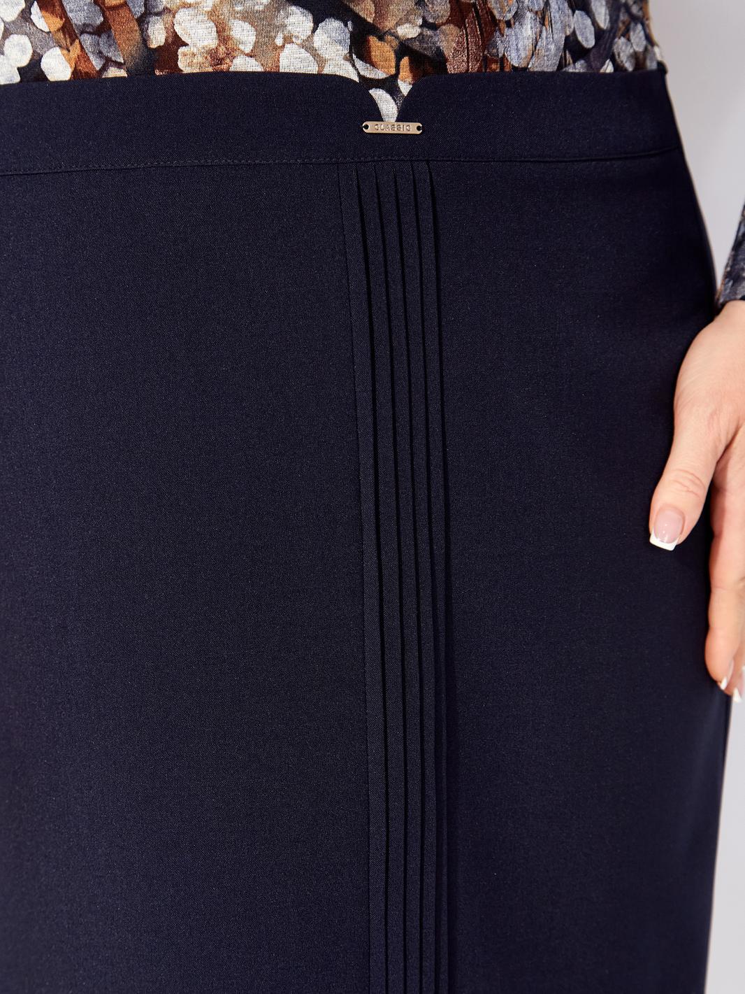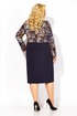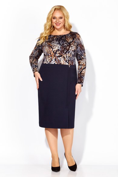 Повседневное платье на рост 164 см полуприлегающего силуэта. В платье сочетается трикотажное полотно (верх) и текстильная ткань (юбка). Вырез горловины круглый. Рукав втачной длинный. Перед платья с нагрудными вытачками из проймы. Спинка со средним швом до талии и талиевыми вытачками. В среднем шве обработана потайная застежка-молния. По переду платья по юбке вертикальные защипы, переходящие в шлицу.
