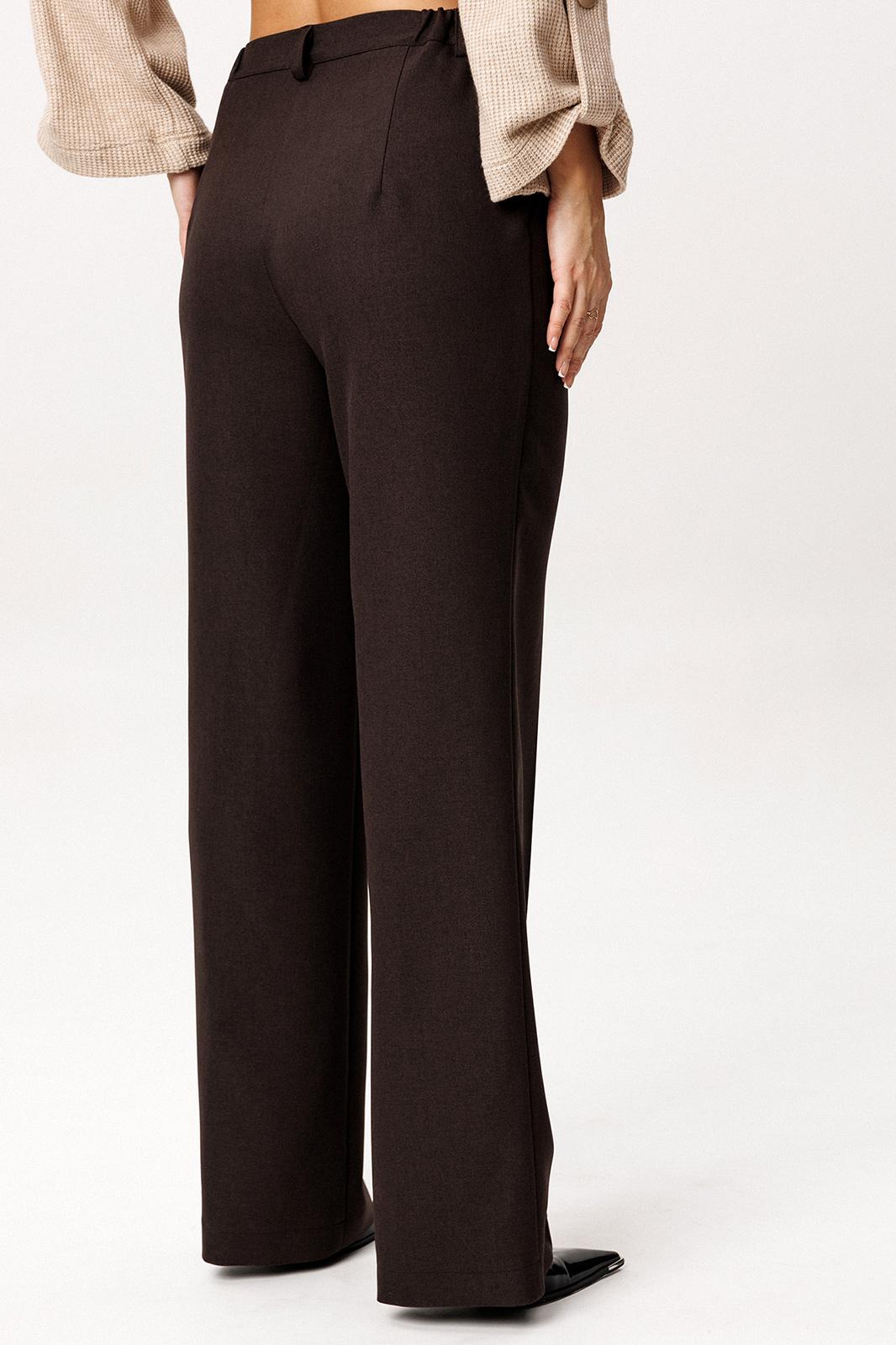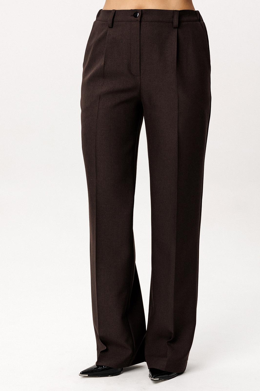 Брюки прямого кроя. На передних половинках небольшая складка, переходящая