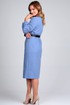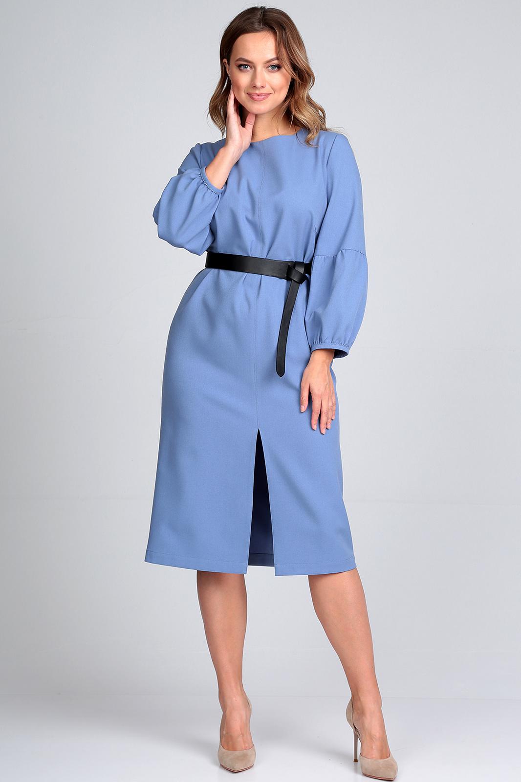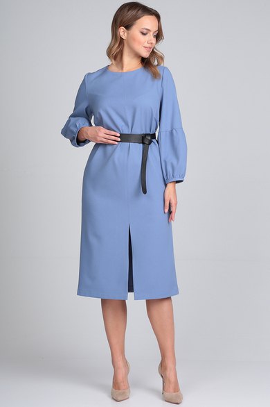 Элегантное платье из ткани средней плотности. Силуэт прямой, вырез горловины округлый с застежкой на молнию по спинке. По переду платья центральный шов переходящий в разрез. Нагрудные выточки. Рукав втачной, состоит из двух частей. Нижняя часть рукава со сборкой. Платье украшает съемный ремень. Длинна платья по середине спинке: 108 см. Длина рукава: 56 см.