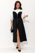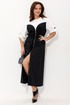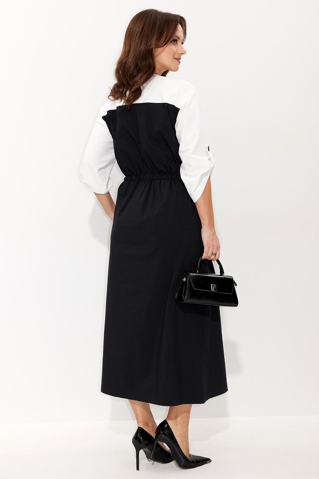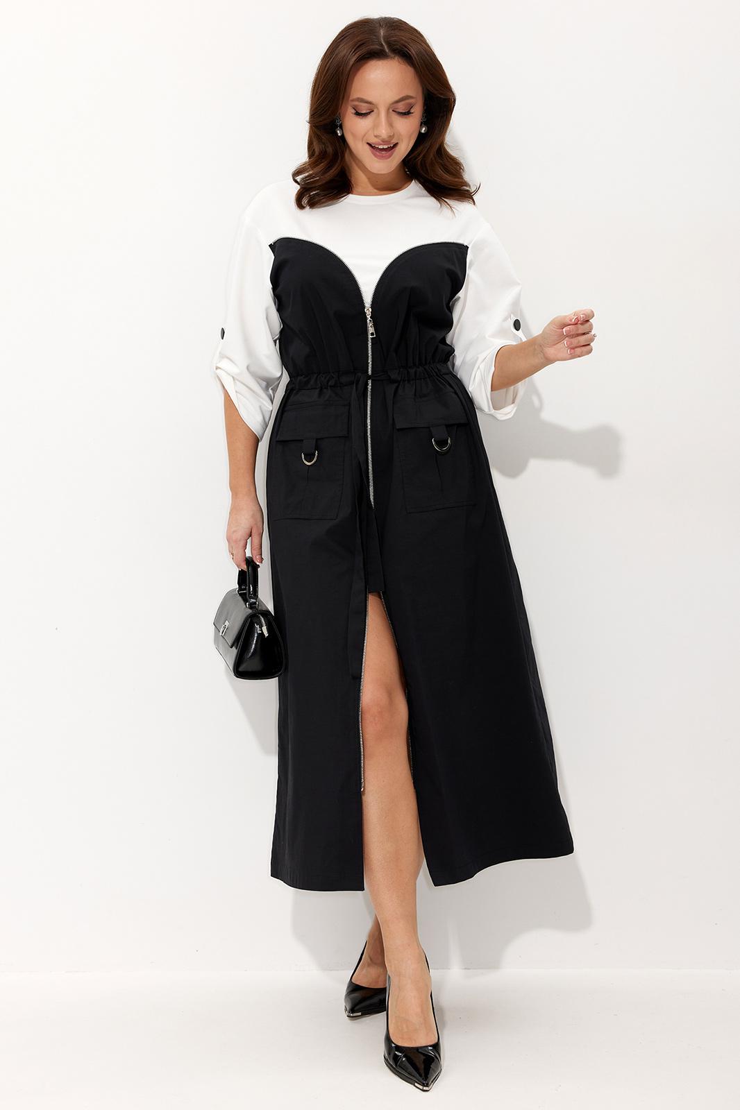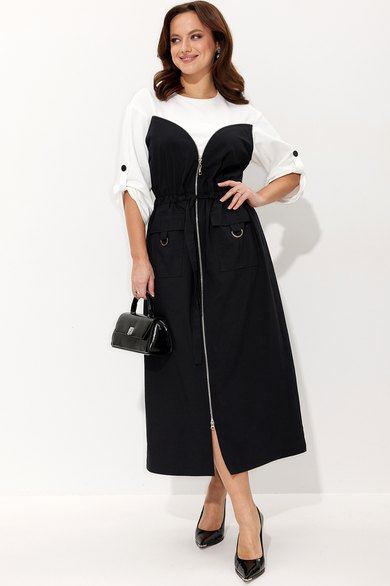 Комфорт - один из ключевых трендов современной действительности, который отлично реализуется в контексте стиля «спорт-кэжуал». Его выбирает тот, кто не желает ограничивать себя жёсткими рамками, стремится выглядеть модно и динамично и не считает, что красота требует жертв. Платье выполнено из двух видов ткани: трикотажа (верхняя часть лифа платья и рукава) и хлопка (нижняя часть лифа платья и юбка). Платье отрезное по линии талии на кулисе, в которую вставлен пояс-завязка что позволяет регулировать приталивание. По переду платья от проймы вставлена декоративная молния с двумя бегунками, что позволяет регулировать высоту разреза. Спереди накладные карманы с клапаном и патой декорированной металлическим полукольцом. Спущенная линия плеча. Низ рукава поддерживается декоративной патой на петлю и пуговицу.