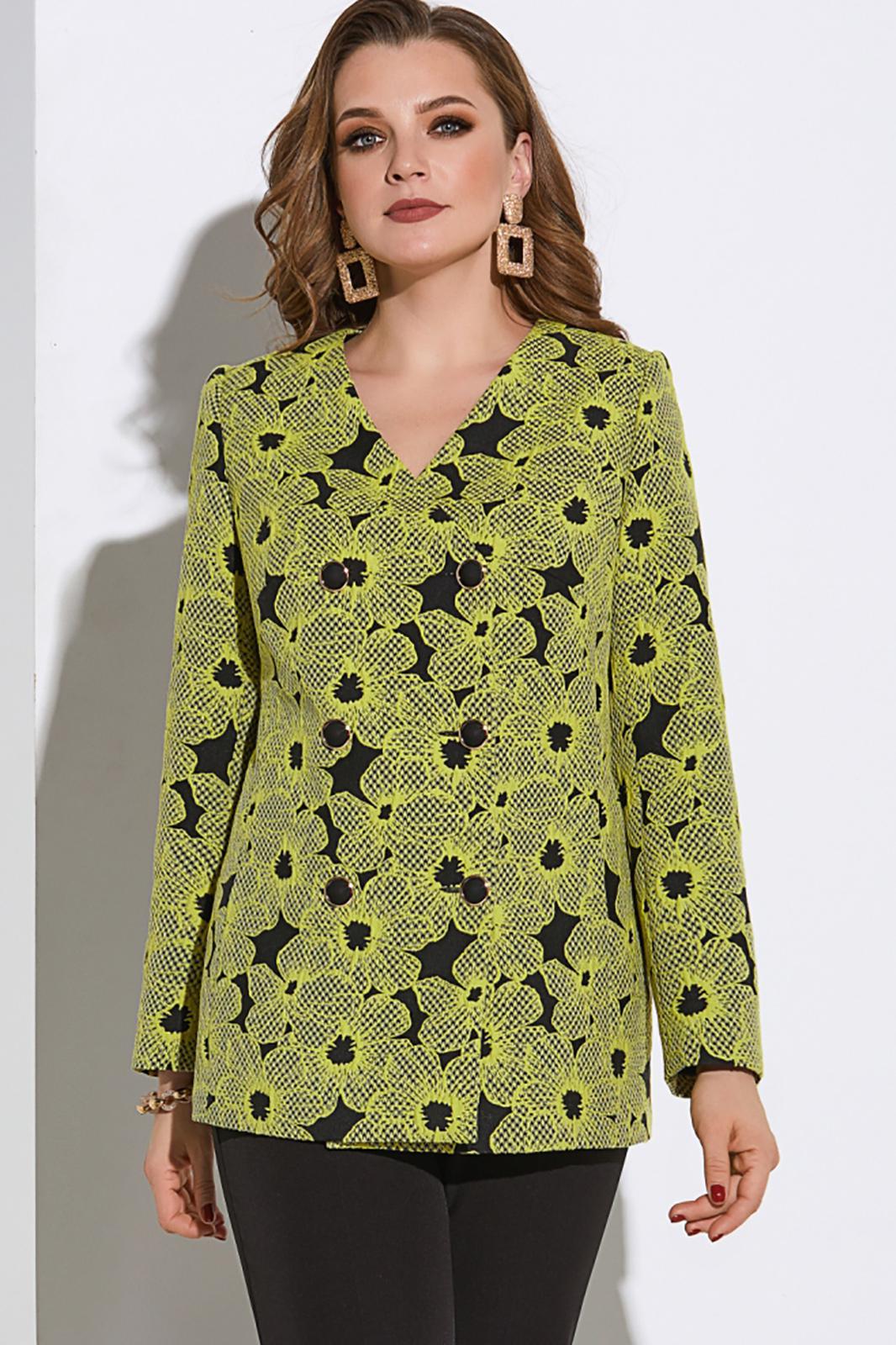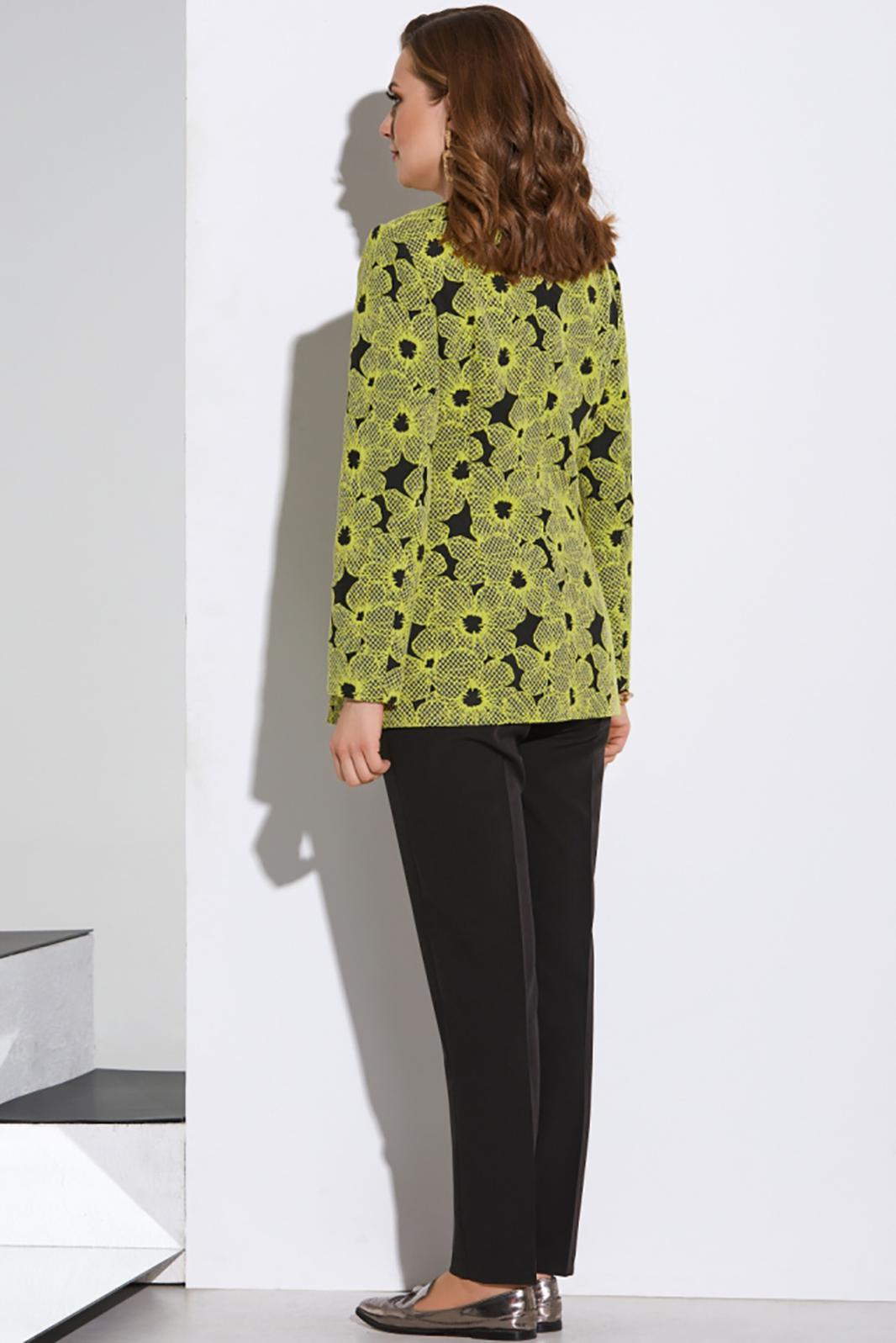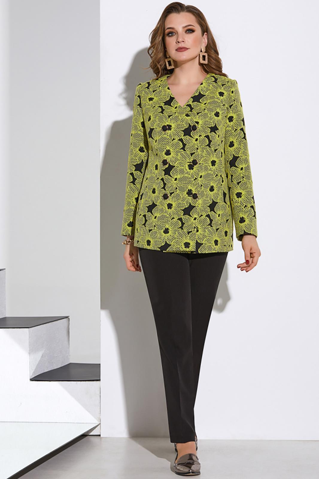 Дизайнерский костюм выполнен из жаккарда с цветочным мотивом в сочетании с однотоном. Двубортный жакет прямого силуэта с V-образным вырезом. Перед оформлен отрезными бочками с нагрудными вытачками, спинка со средним швом и талиевыми вытачками. На обтачке спинки жакета выполнена аккуратная вышивка. Рукава втачные. Брюки средней посадки с отрезным поясом заужены к низу. Застежка обработана по классической технологии (гульфик с молнией и пуговица на поясе). Вся обработка выполнена как в классических итальянских костюмах. Жакет на подкладке.
