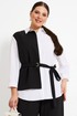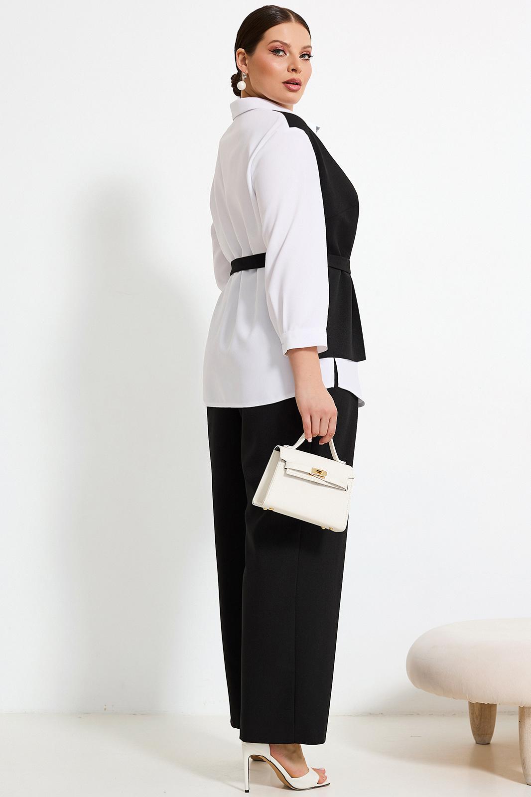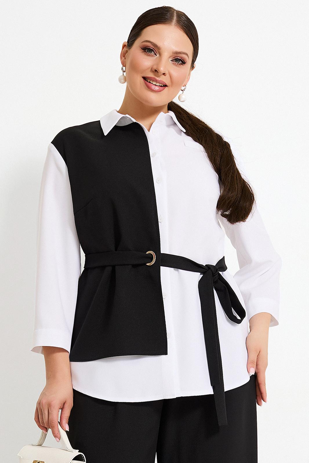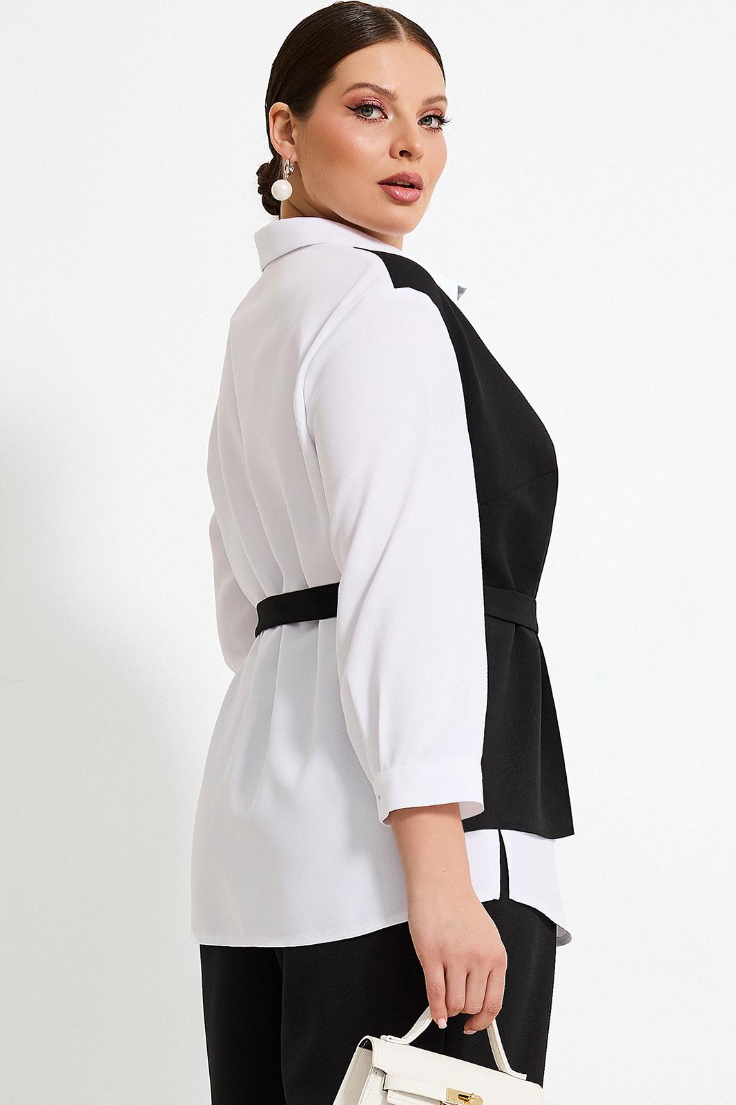 Блуза со стояче-отложным воротником и застёжкой на петли и пуговицы. Перед с деталью из контрастной ткани с одной стороны. Изделие со съёмным поясом по талии. Рукава втачные с манжетами по низу.