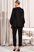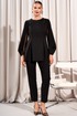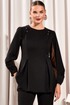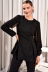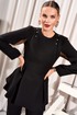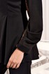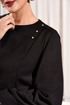 Свитшот с округлым вырезом горловины и складками от рельефов по переду и спинке. Перед со стразами в верхней части. Спинка с потайной молнией в среднем шве. Рукава втачные со складками по окату и со складками нижней части рукава, и с деталью из декоративной сетки и подложки.