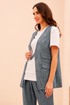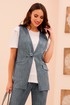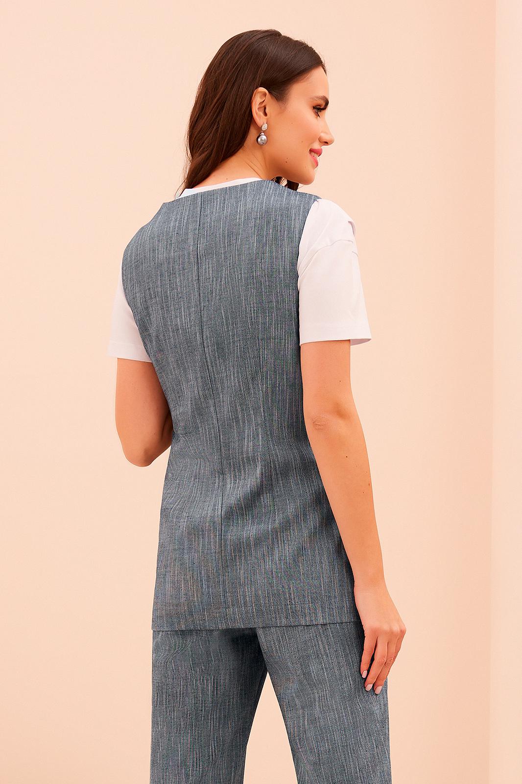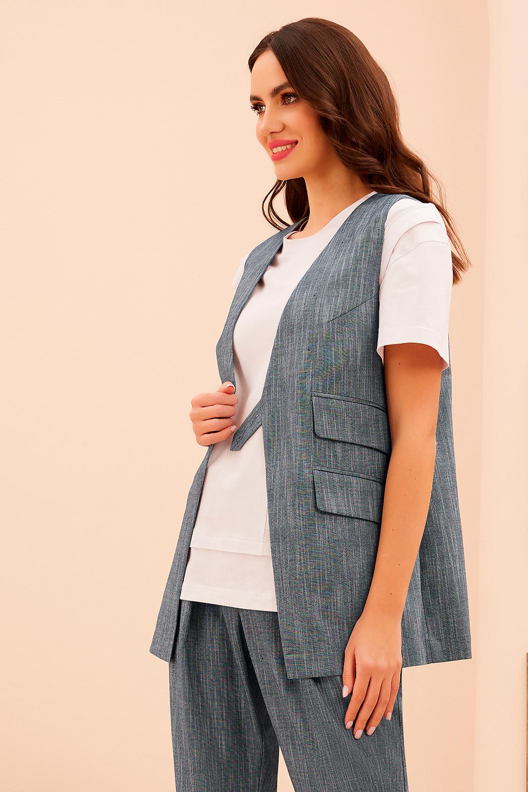Жилет с V – образным вырезом горловины и центральной застёжкой на петлю с пуговицей. Перед с карманами в нижней части и одним декоративным клапаном. Спинка со средним швом и двумя вытачками.
