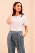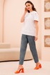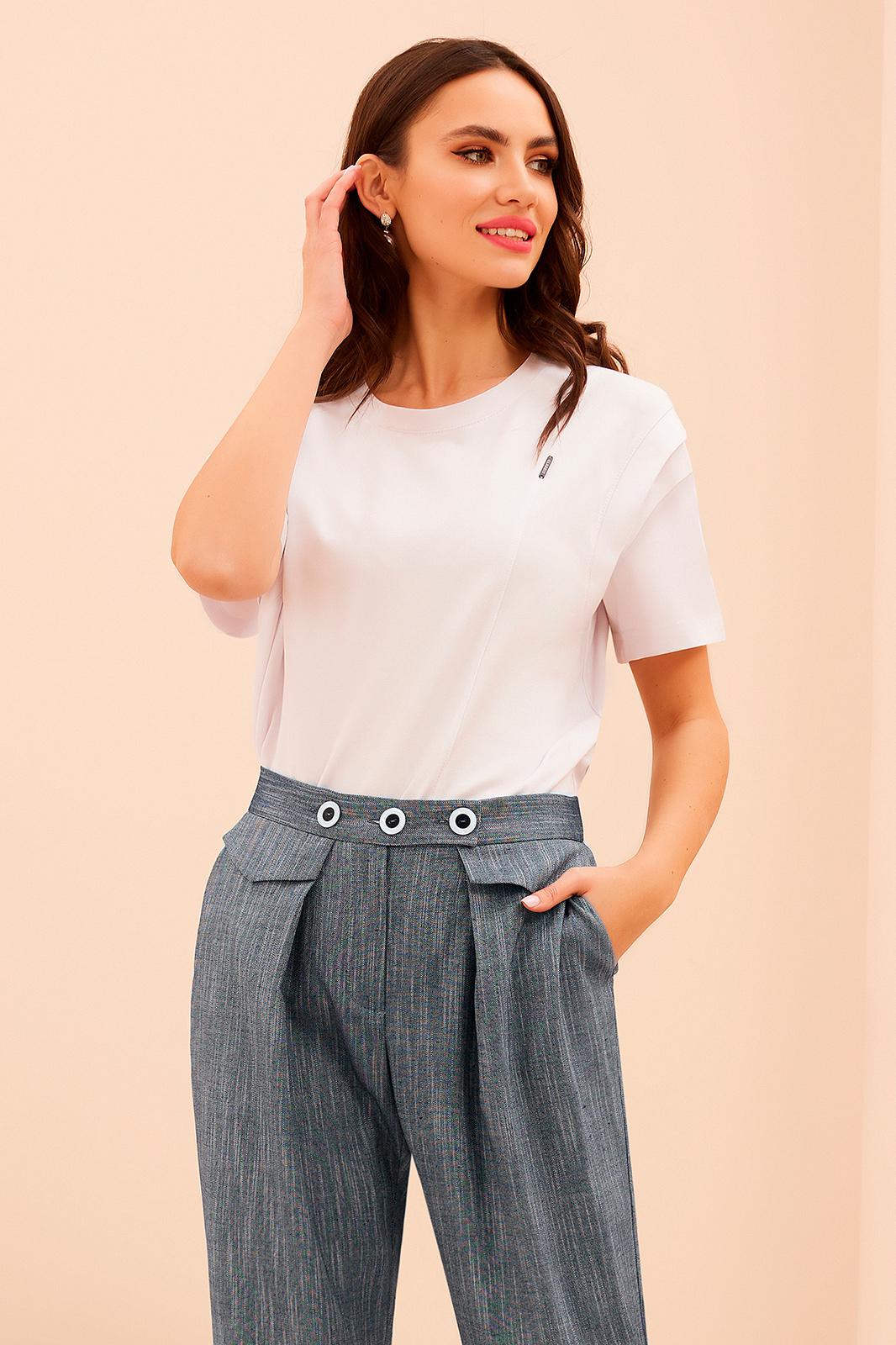 Брюки на поясе с резинкой и наклонными карманами к боковым швам. Передние половинки с декоративными клапанами и складками от пояса.