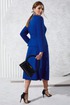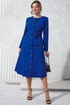 Жакет с округлым вырезом горловины и центральной застёжкой на петли и пуговицы и потайные пуговицы. На уровне талии съёмный пояс из основной ткани. Перед изделия отрезной по талии, со складками от подреза и декоративными клапанами. Спинка со средним швом и двумя рельефами. Рукава втачные. Изделие на подкладке. Юбка на притачном поясе. Переднее полотнище с центральной застёжкой на петли и пуговицы и наклонными карманами к боковым швам. Юбка на подкладке.