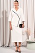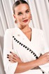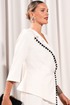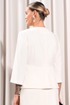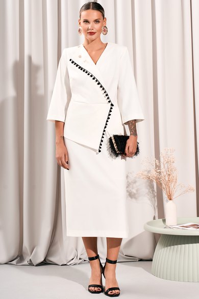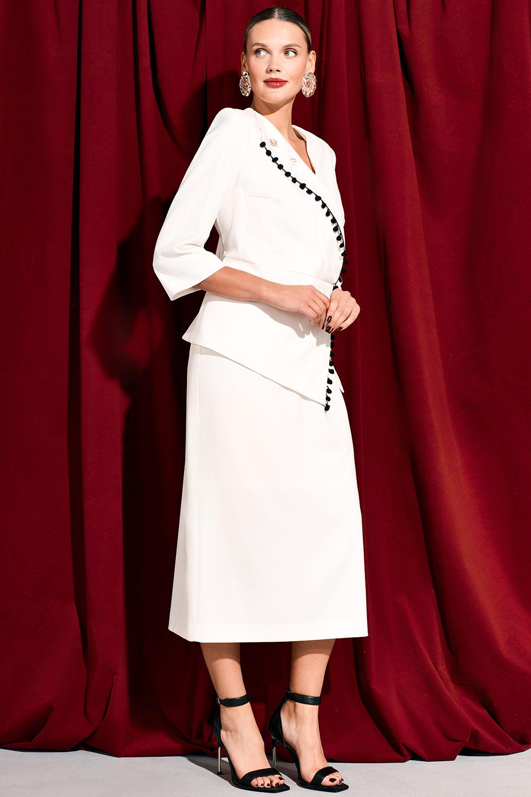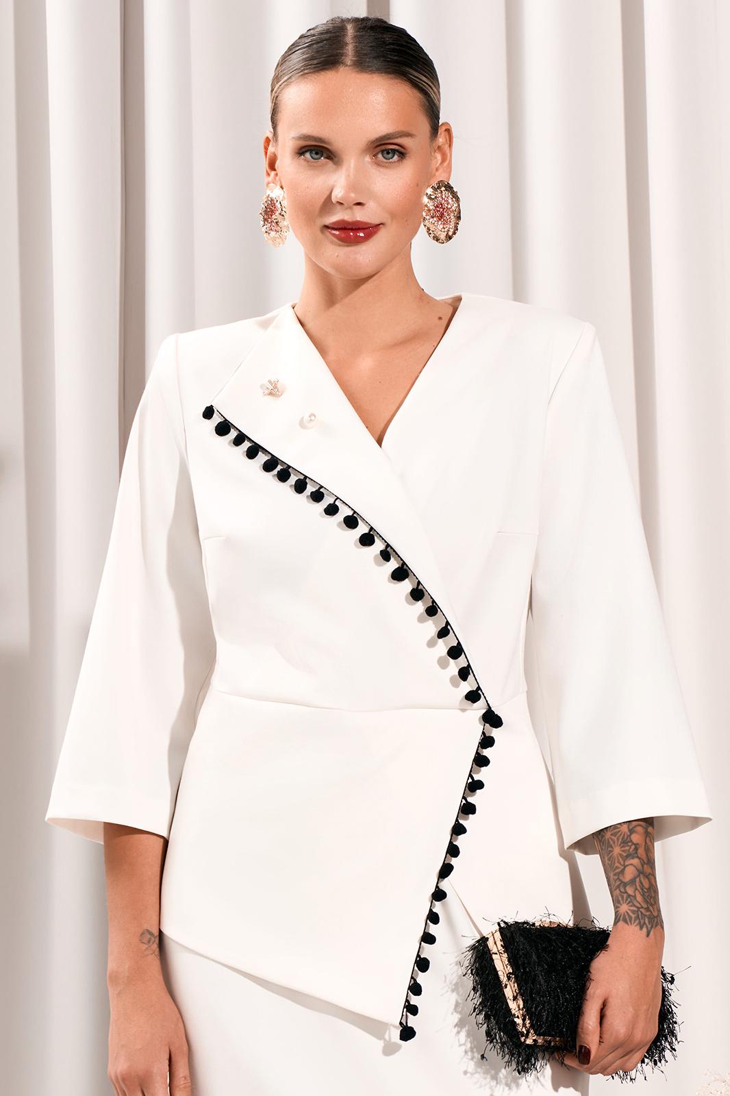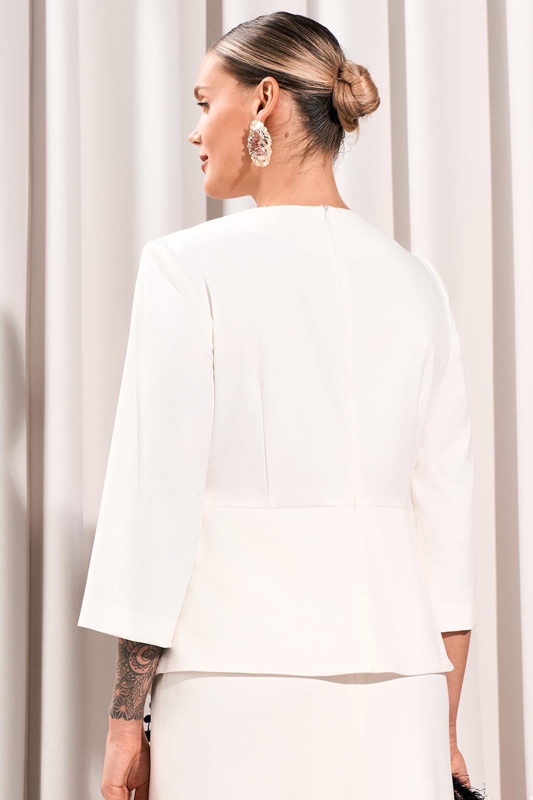 Блуза с V- образным вырезом горловины, фигурным низом и баской. Перед с брошью на лацкане и пришивным декором по краю. Спинка с потайной молнией в среднем шве и талиевыми вытачками до баски. Рукава втачные.