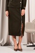 Юбка на поясе с резинкой. Переднее полотнище с разрезом в нижней части и настрочной декоративной тесьмой. Заднее полотнище с потайной молнией в среднем шве. Юбка на подкладке.