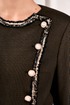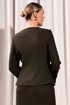 Жакет с округлым вырезом горловины и смещённой застёжкой на петли и пуговицы. Изделие с отрезной баской. Перед с клапанами от баски. Спинка со средним швом и талиевыми вытачками до баски. Рукава втачные. По горловине и краю борта располагается декоративная тесьма. Жакет на подкладке.