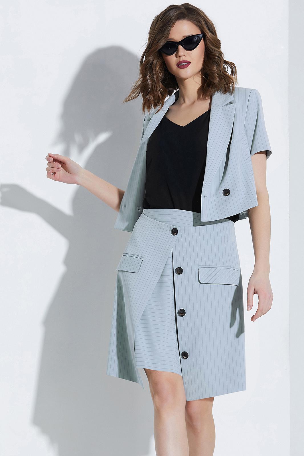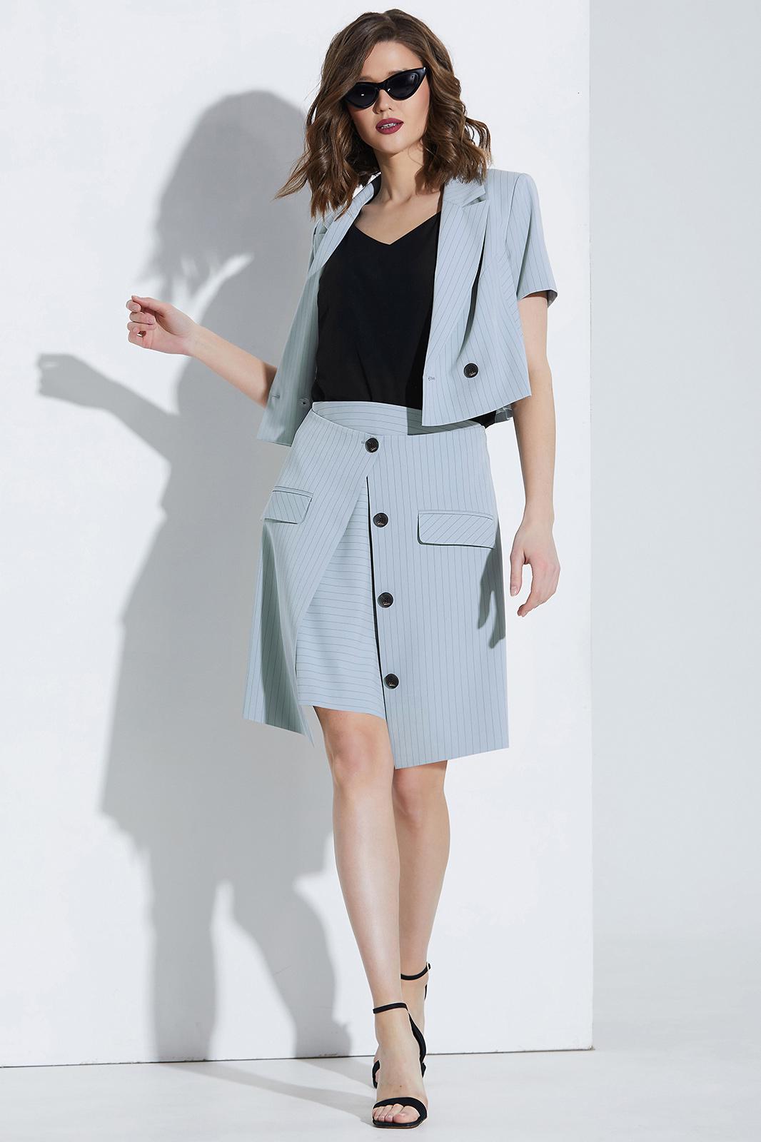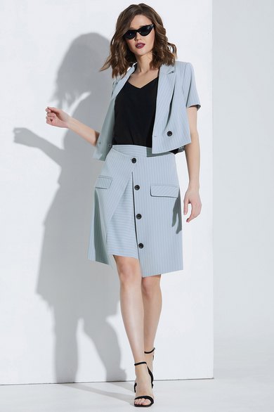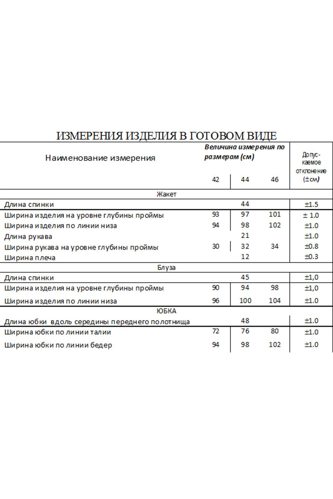 Костюм юбочный. Жакет с воротником пиджачного типа и двубортной застёжкой на петли и пуговицы. Перед с рельефами. Рукава втачные. Жакет на подкладке. Блуза на бретелях. Юбка на обтачке. Переднее полотнище двухслойное. Верхний слой с застёжкой на петлю и пуговицу, декоративные пуговицы и карманы с клапанами. Заднее полотнище с потайной молнией в среднем шве. Юбка на подкладке.