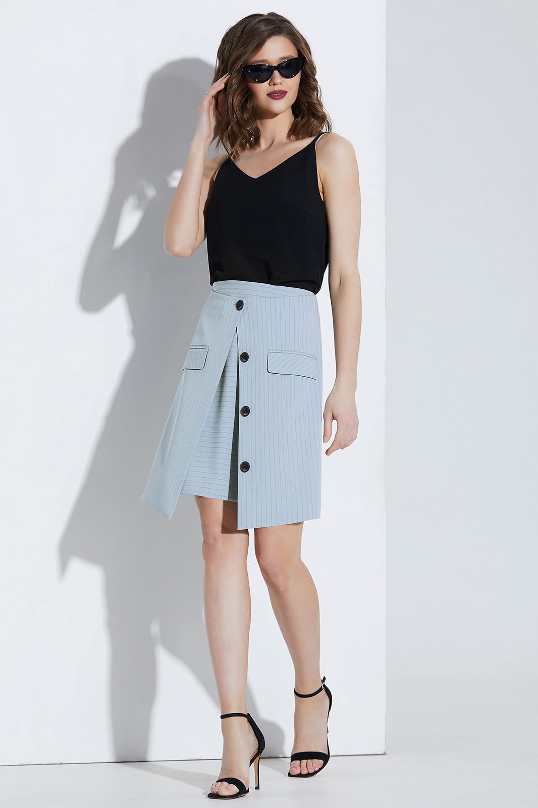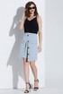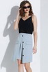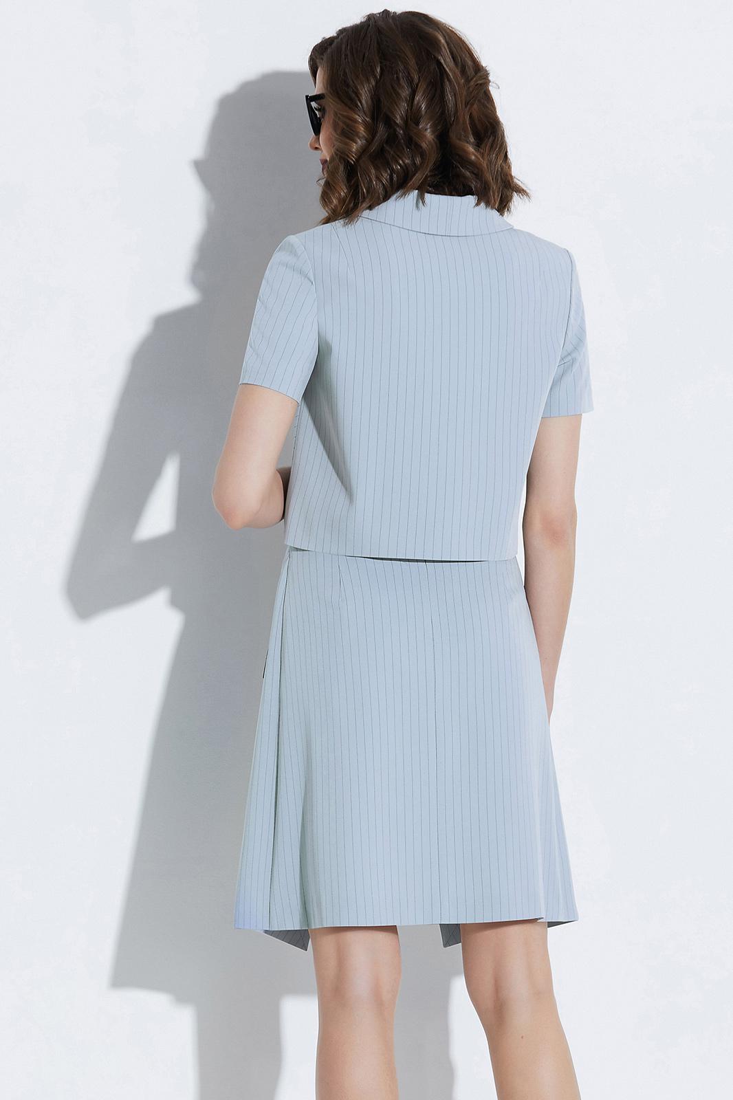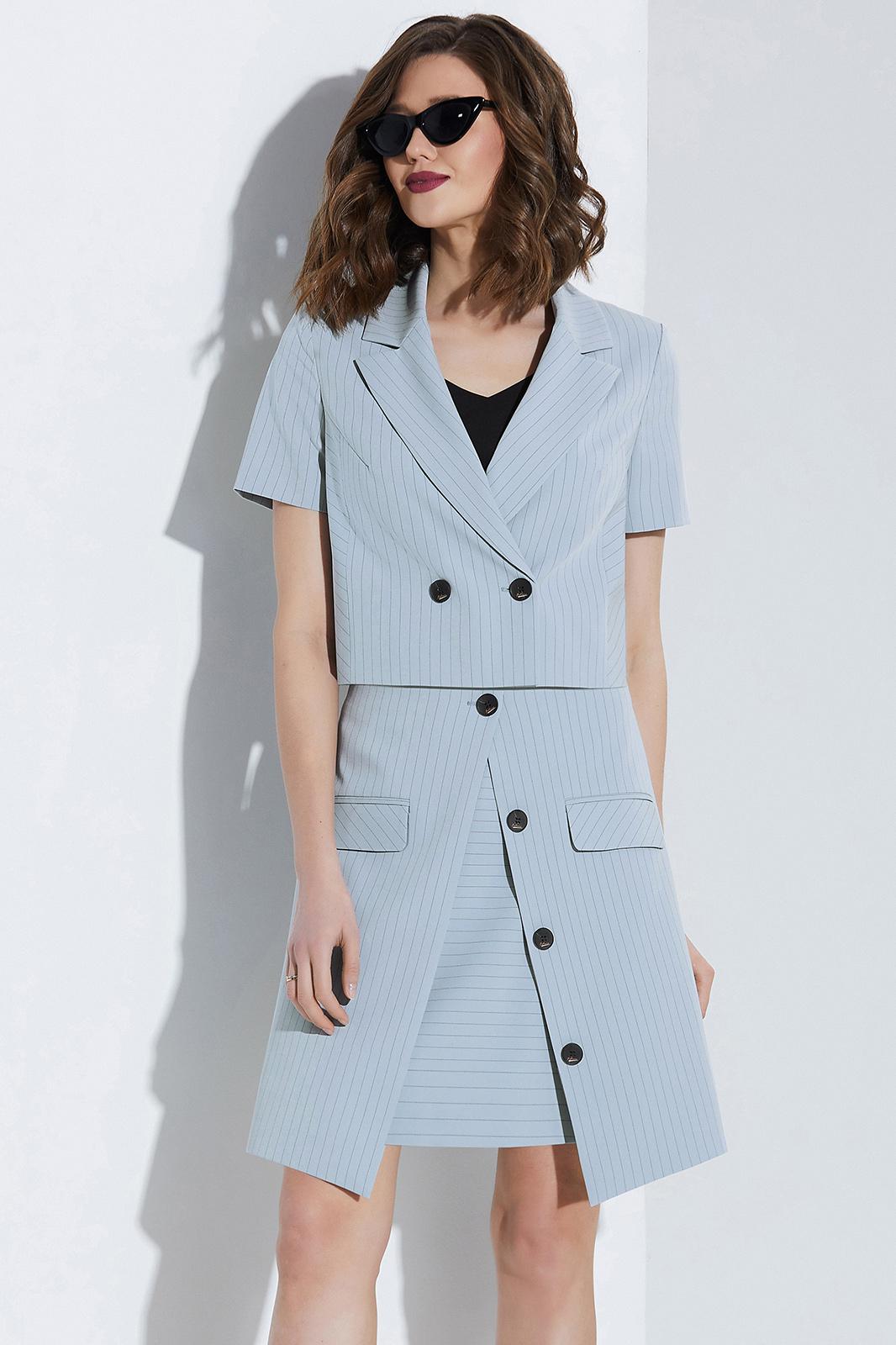 Костюм юбочный. Жакет с воротником пиджачного типа и двубортной застёжкой на петли и пуговицы. Перед с рельефами. Рукава втачные. Жакет на подкладке. Блуза на бретелях. Юбка на обтачке. Переднее полотнище двухслойное. Верхний слой с застёжкой на петлю и пуговицу, декоративные пуговицы и карманы с клапанами. Заднее полотнище с потайной молнией в среднем шве. Юбка на подкладке.
