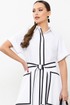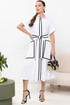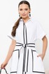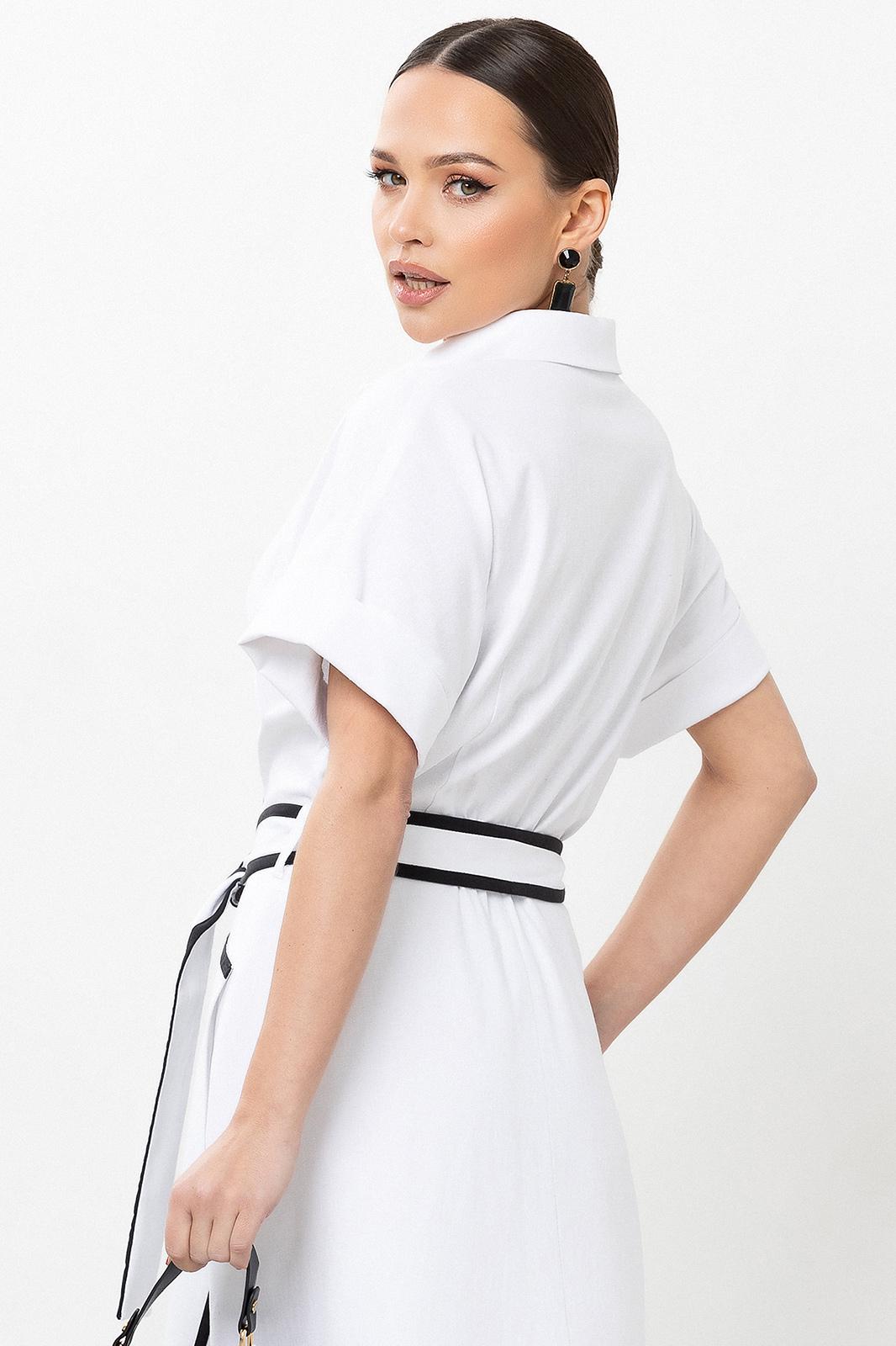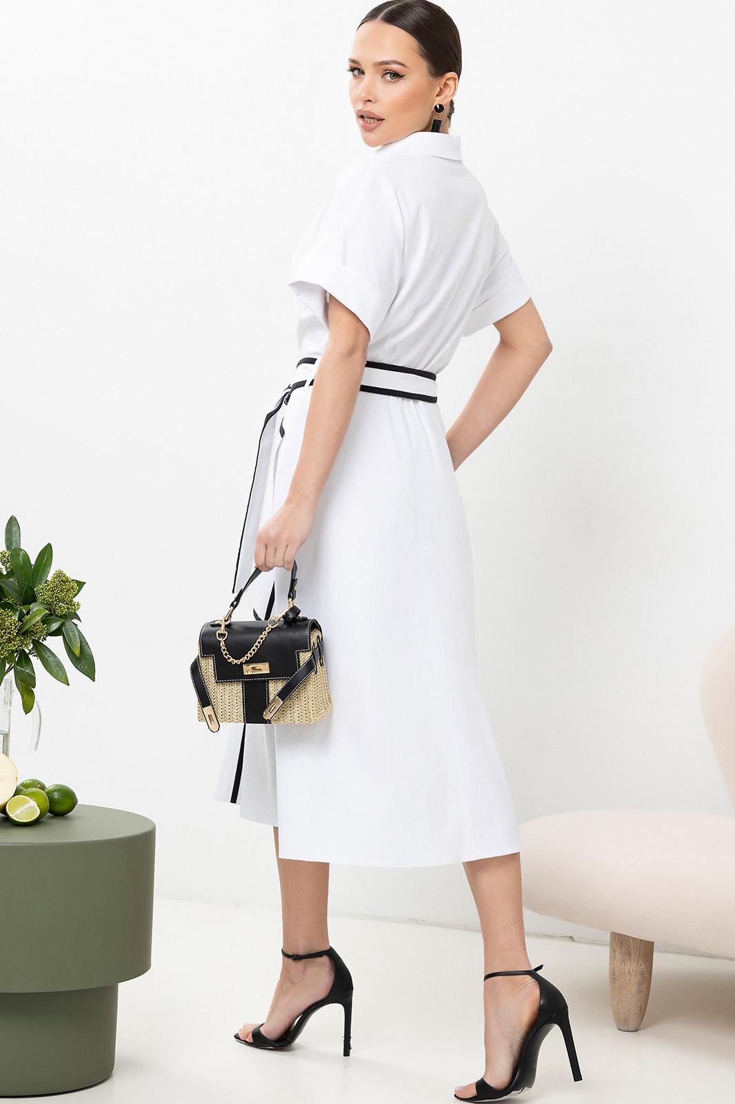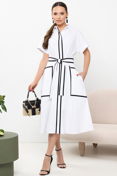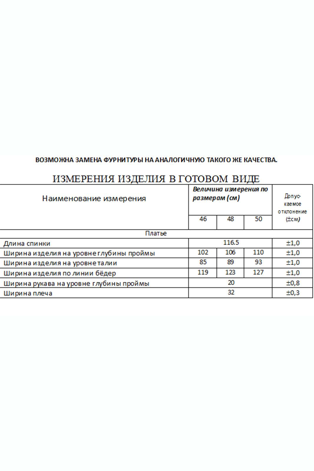 Платье со стояче-отложным воротником, отрезное по талии и центральной застёжкой на пуговицы. На уровне талии съёмный пояс из ткани с контрастной отделкой. Перед с накладными карманами в нижней части. Спинка с талиевыми вытачками и средним швом от талии. Платье с цельнокроеными рукавами и с отворотами по низу. По планке и карманам отделка из контрастной ткани. Изделие на подкладке от талии.