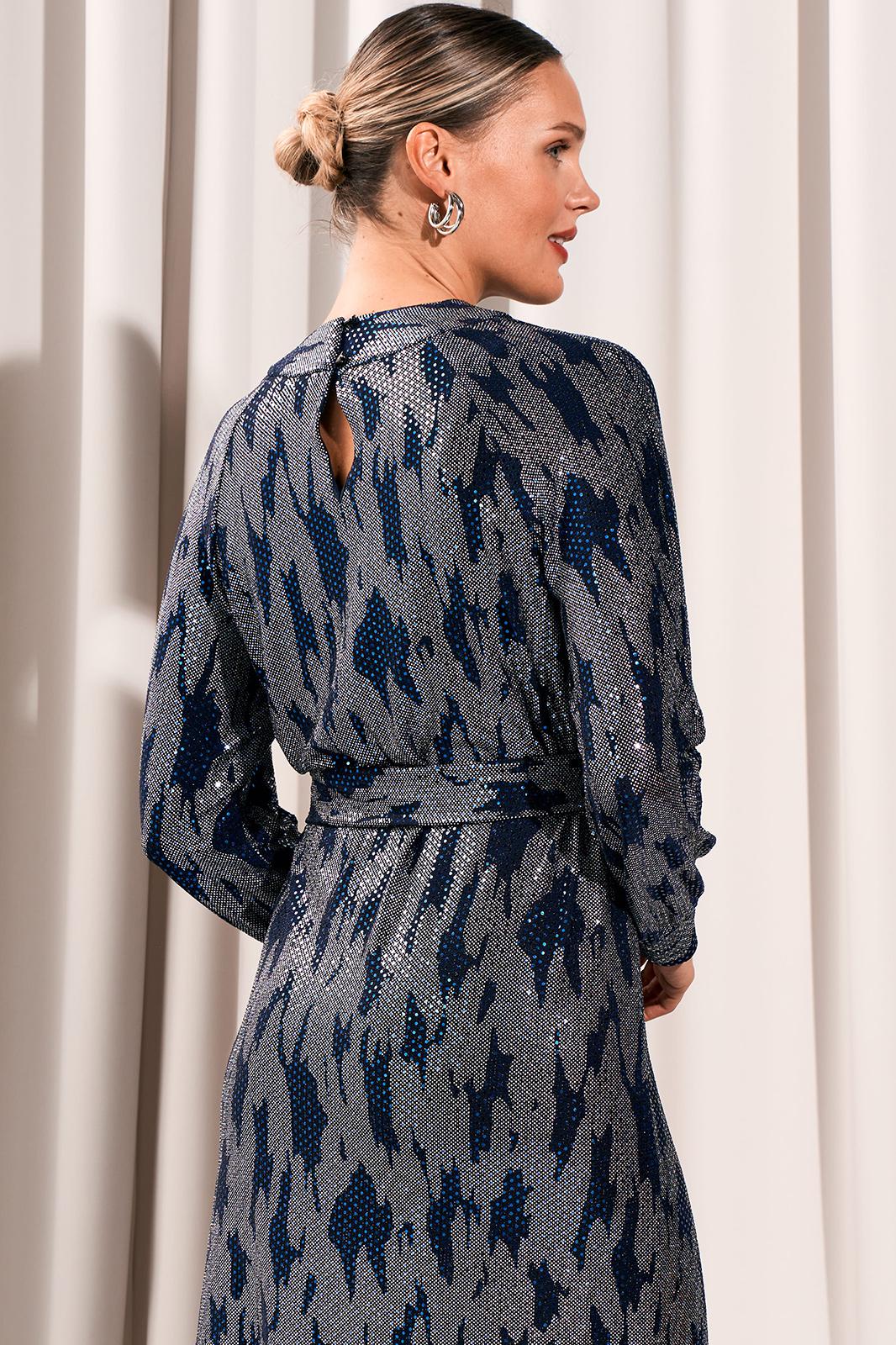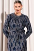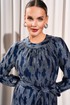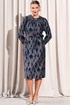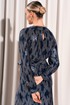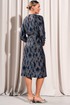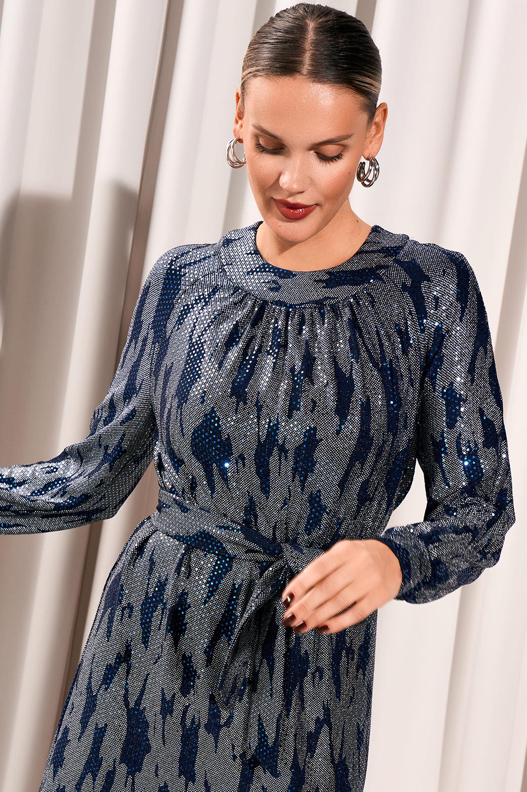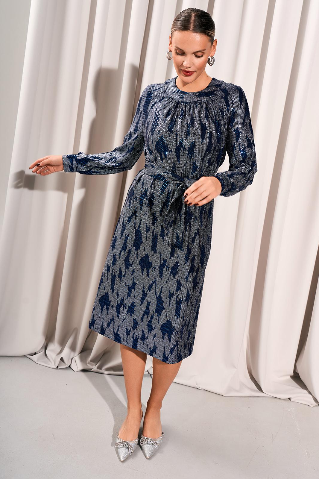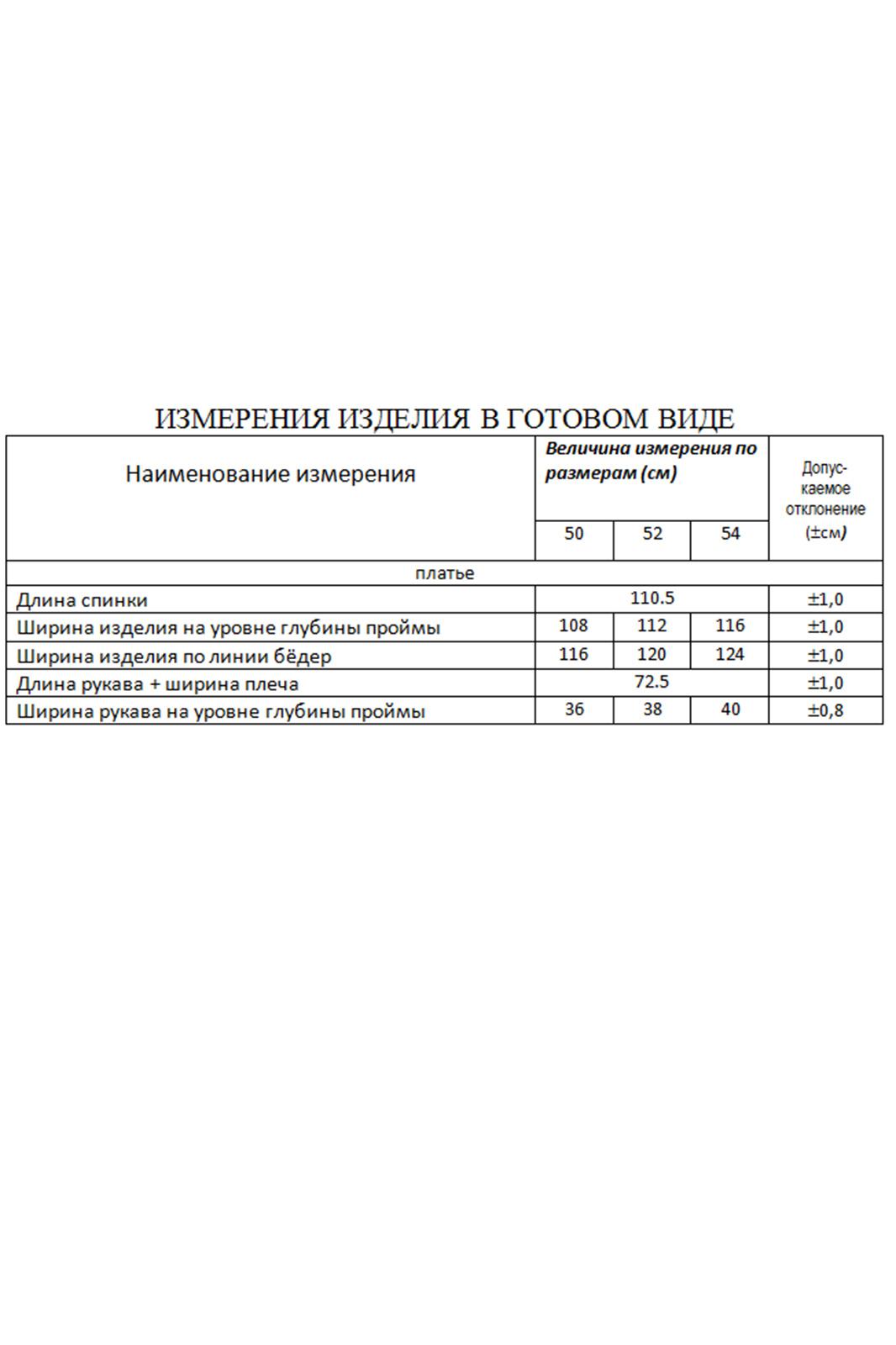 Платье с отрезной деталью по горловине и сборкой от неё по переду. Спинка с застёжкой на петлю с пуговицей в верхней части. Рукава покроя реглан с манжетами в нижней части. По талии съёмный пояс из основной ткани.