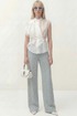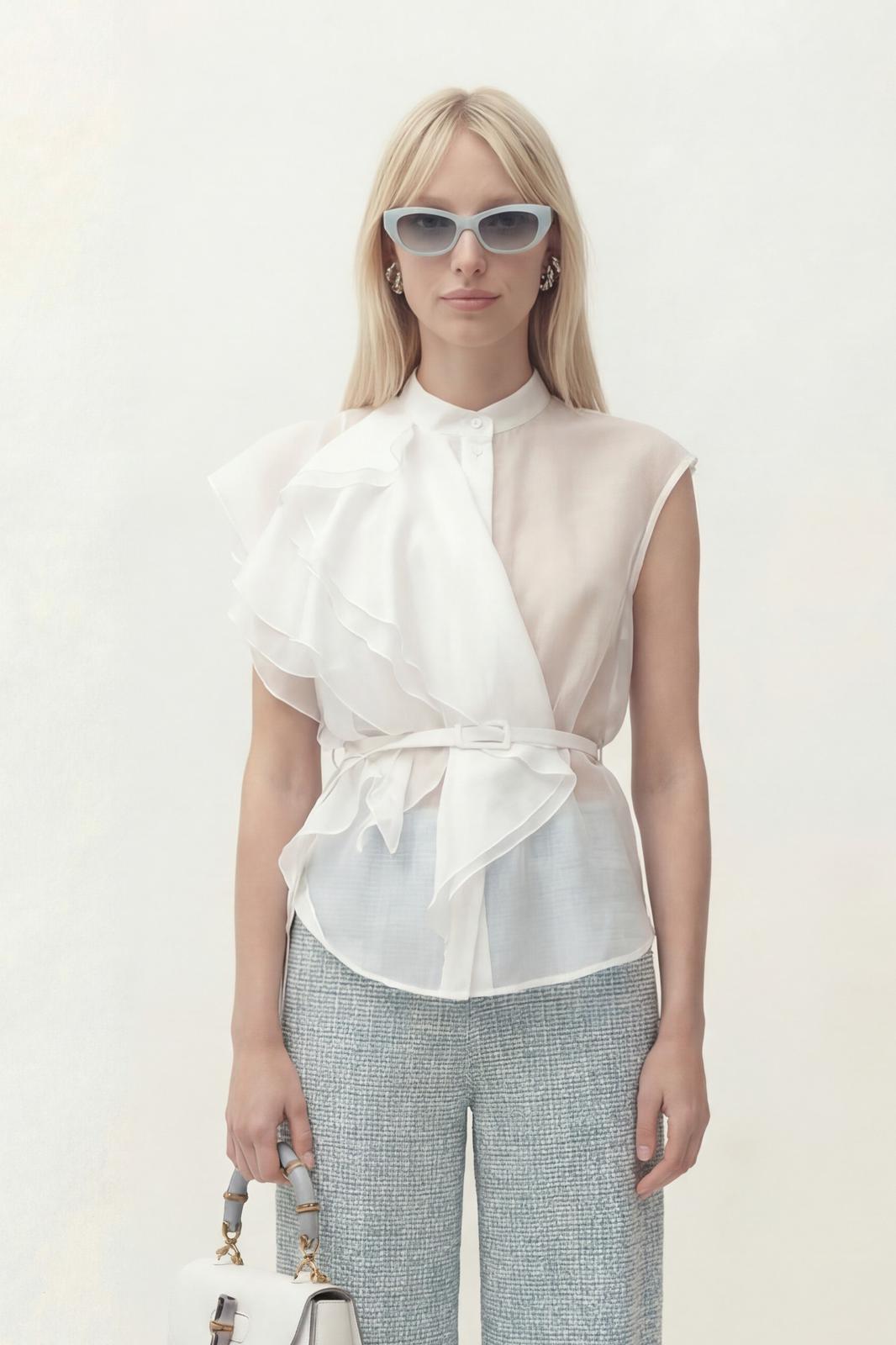 Блуза прямого силуэта, по горловине воротник-стойка. Центральная застежка на петли и пуговицы. На левой стороне блузы настрочные воланы.