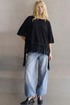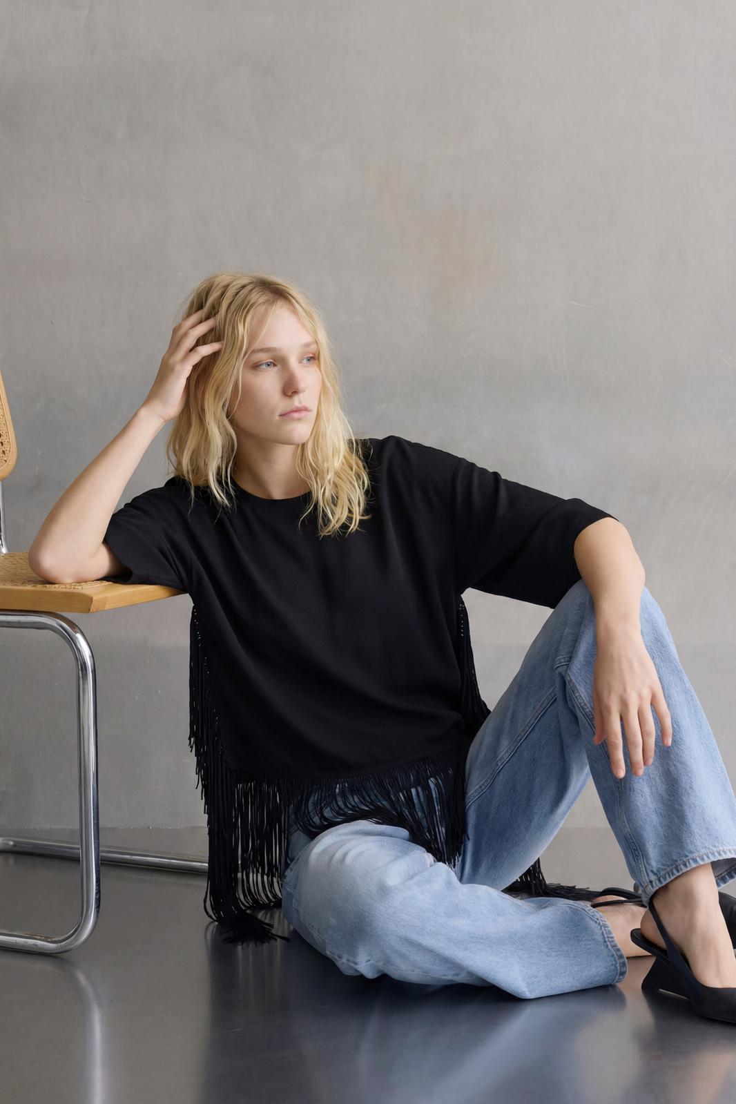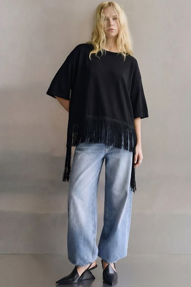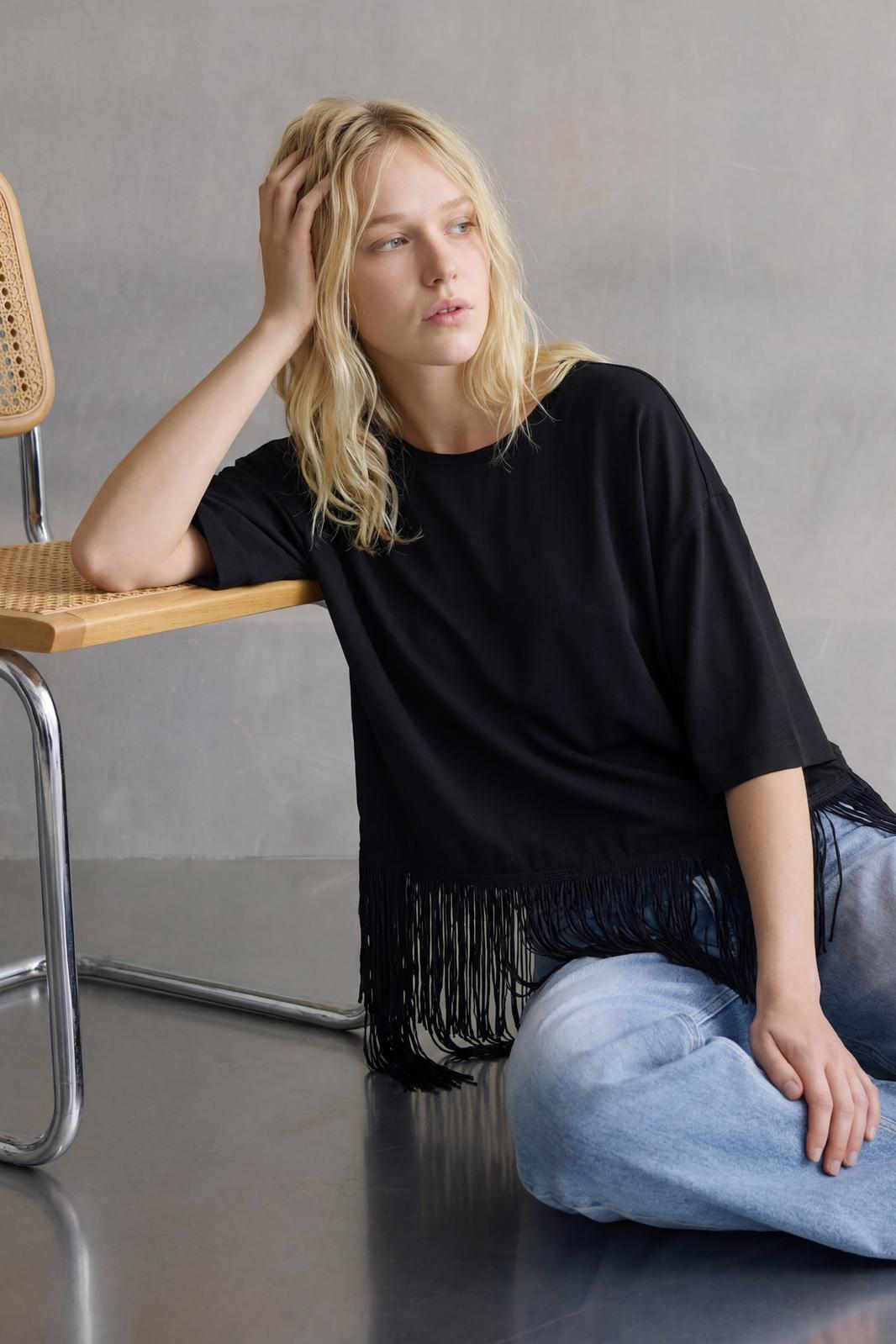 Блуза свободного кроя выполнена из трикотажного полотна, линия плеча спущена, рукав кроткий, округлый вырез горловины обработан бейкой, по переду к низу пришита бахрома с отлетными концами.
