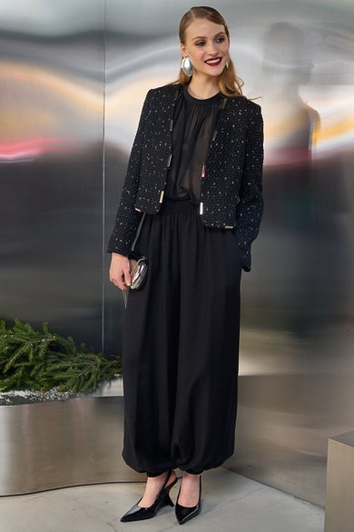 Брюки-алладины свободного кроя. По линии на резинке. По низу брюк также резинка. В боковых швах карманы.