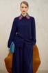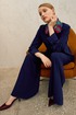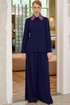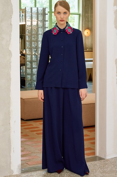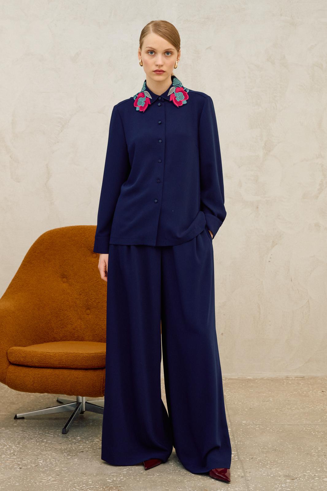 Комплект брючный выполнен из струящейся ткани. Рубашка прямого силуэта, свободного кроя. Рукав втачной длинный, по низу рукава притачная манжета на застежку. Воротник с эффектом аппликативной вышивки. Застежка центральная. Брюки на притачном поясе, застежка на молнию. В боковых швах прорезные карманы.