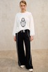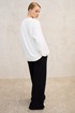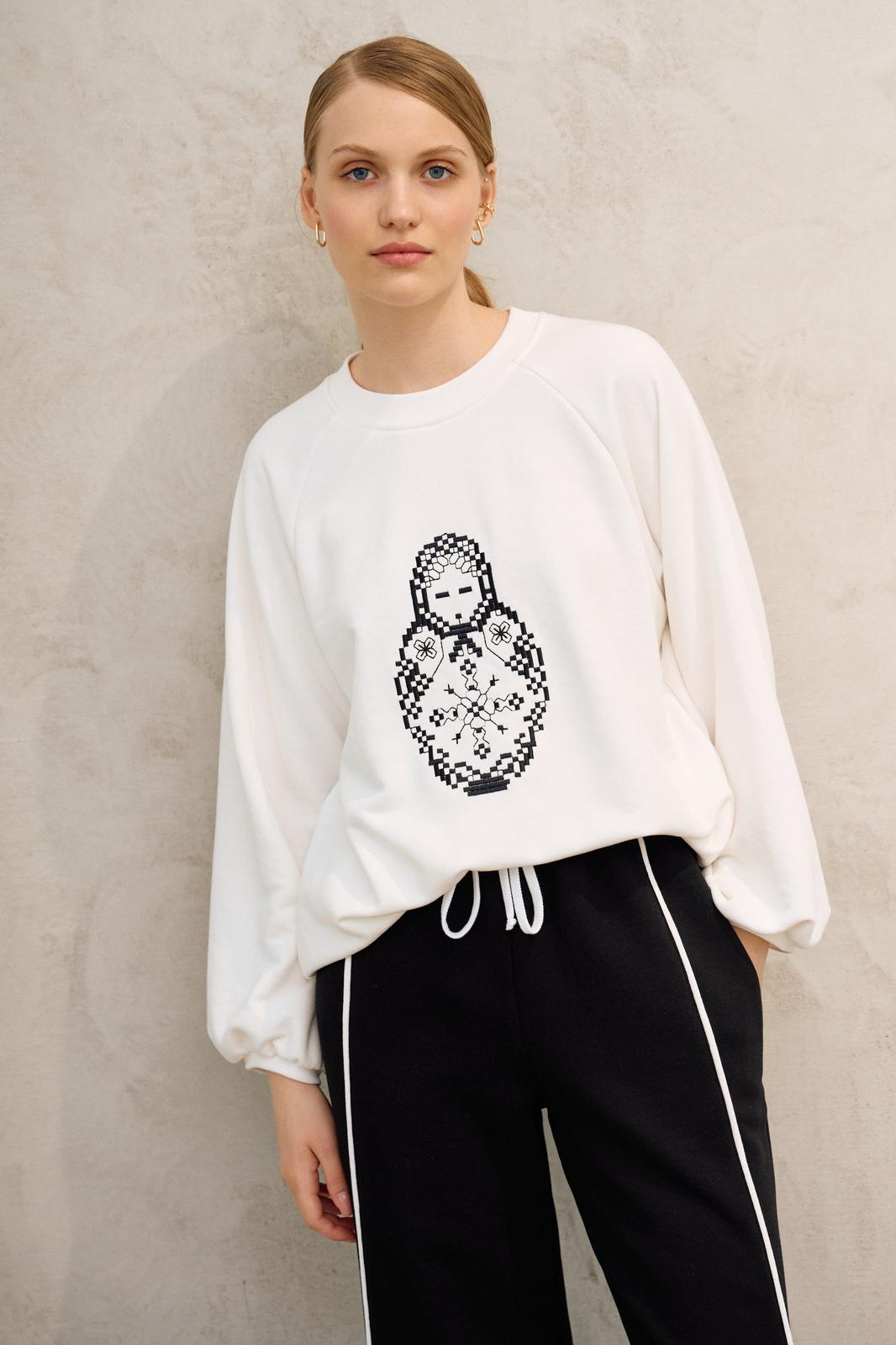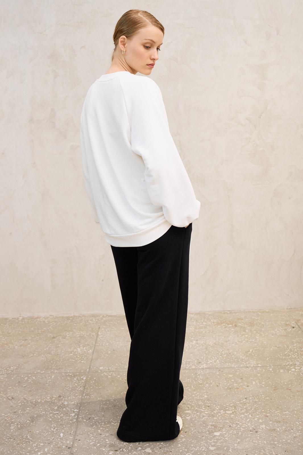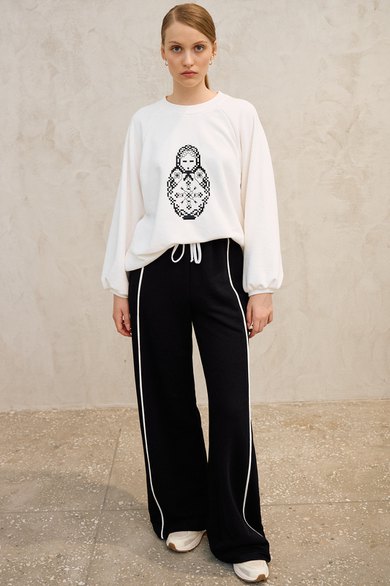 Спортивный костюм выполнен из трикотажного полотна. Худи свободного кроя. Линия плеча спущена, рукав длинный, по низу рукава сборка с притачной планкой. Округлый вырез горловины, планка. По центру худи вышивка, имитирующая ручной стежок. Брюки прямого силуэта, свободного кроя, по поясу резинка и втянут шнур. В боковых швах прорезные карманы. По переду брюк вертикальные подрезы с отделочным кантом.