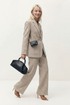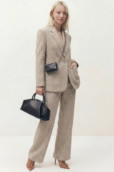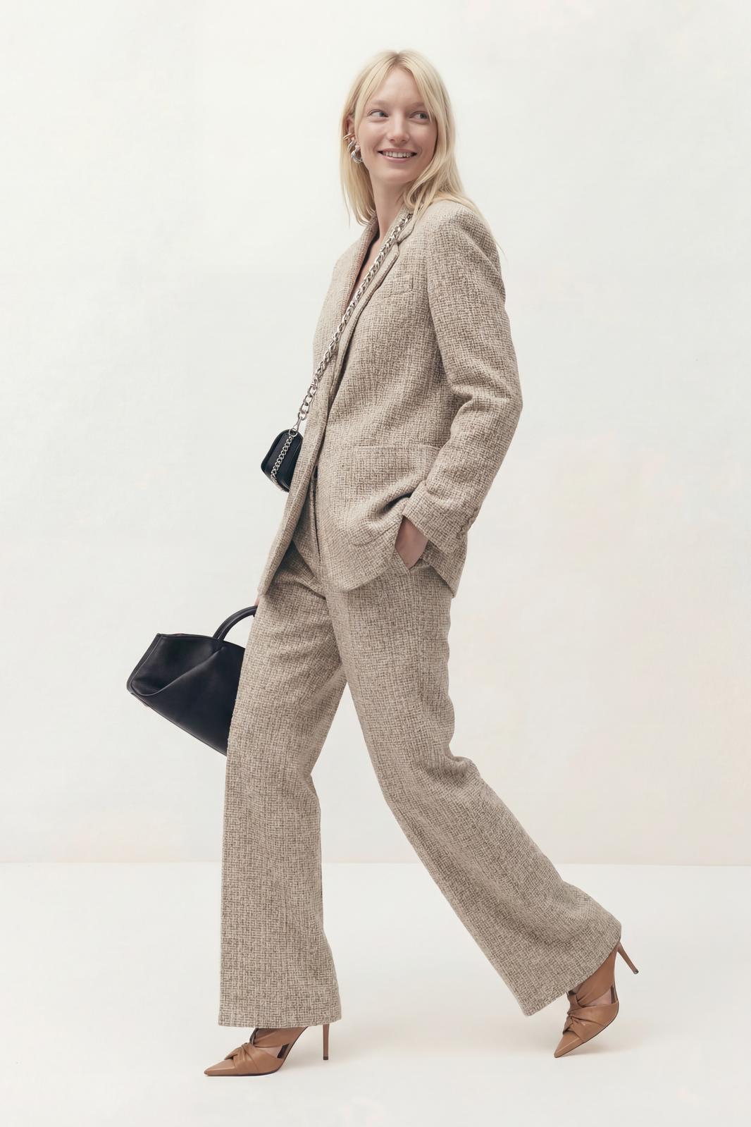 Комплект состоит из жакета и брюк. Жакет свободного кроя прямого силуэта на подкладке. Рукав втачной длинный, шлица по локтевому шву. Воротник пиджачного кроя, застежка однобортная на петли и пуговицы, по бокам накладные карманы. По спинке средний шов и рельефы. Брюки прямого силуэта с завышенной линией талии и цельнокроеным поясом, по бокам прорезные карманы. Застёжка на задней половине брюк по линии сидения. По переду брюк от линии пояса вертикальные защипы.