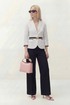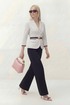 Костюм брючный. Жакет на хлопковой подкладке. Рукав втачной ¾, по низу рукава отделка. По переду воротник пиджачного типа с лацканом, застёжка на петли и пуговицы, по бокам прорезные функциональные карманы с клапаном, от шва кармана выходит нагрудная вытачка. По спинке средний шов. Брюки свободного кроя на притачном поясе на резинке, в боковых швах прорезные карманы, по низу отлетные шлицы.
