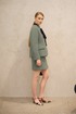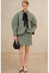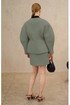 Комплект состоит из полупальто и юбки. Полупальто полуприлегающего силуэта на подкладке. Линия плеча спущена, рукав фигурной формы. Цельнокроеный воротник, переходящий в центральную застежку на потайные кнопки. По переду прорезные карманы с отлетными клапанами. По спинке средний шов и рельефы. Юбка в длине мини, прямого силуэта, на обтачке. По бокам прорезные карманы. По спинке средний шов, переходящий в потайную молнию.