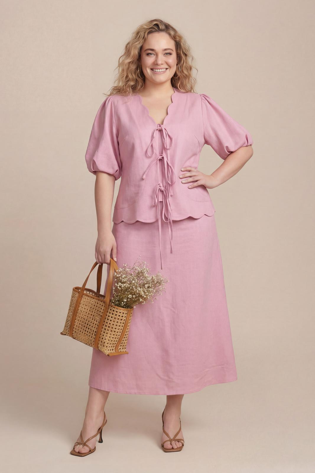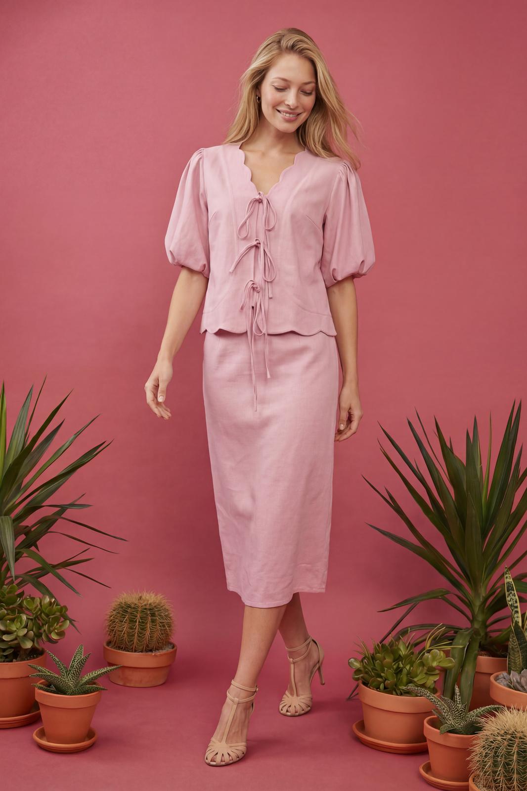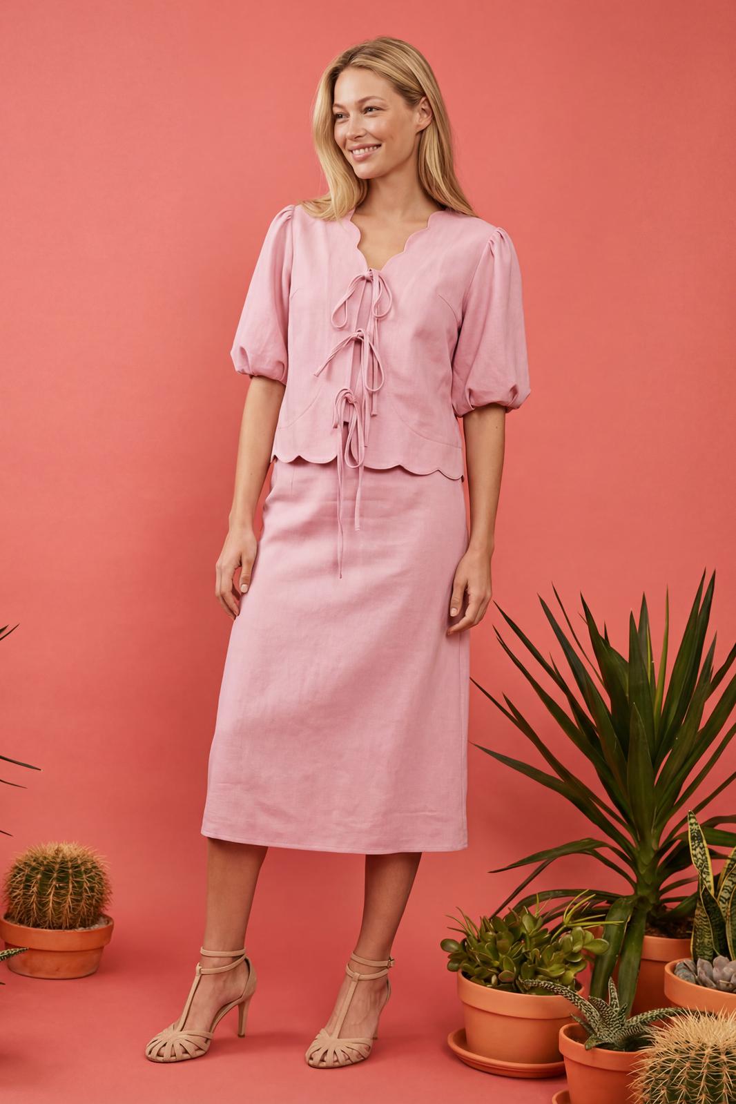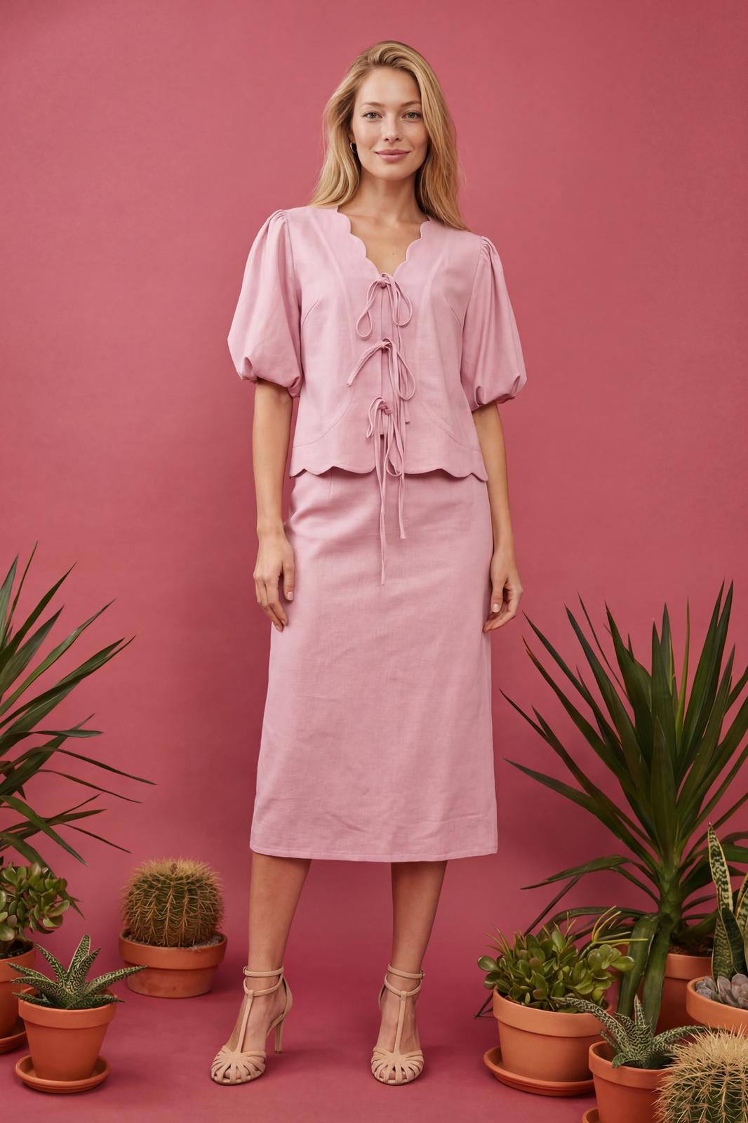 Женский костюм-двойка в романтическом стиле, состоящий из жакета полуприлегающего силуэта и юбки А-силуэта в длине миди. Изделие выполнено из льняной ткани, обладающей умеренной плотностью и формоустойчивостью. Рукав втачной на хлопковой подкладке, объемной формы «фонарик» длиной до локтя. По окату и по низу рукава заложены мягкие сборки. V-образный вырез горловины. Край борта и горловины имеет декоративный фигурный волнообразный край.