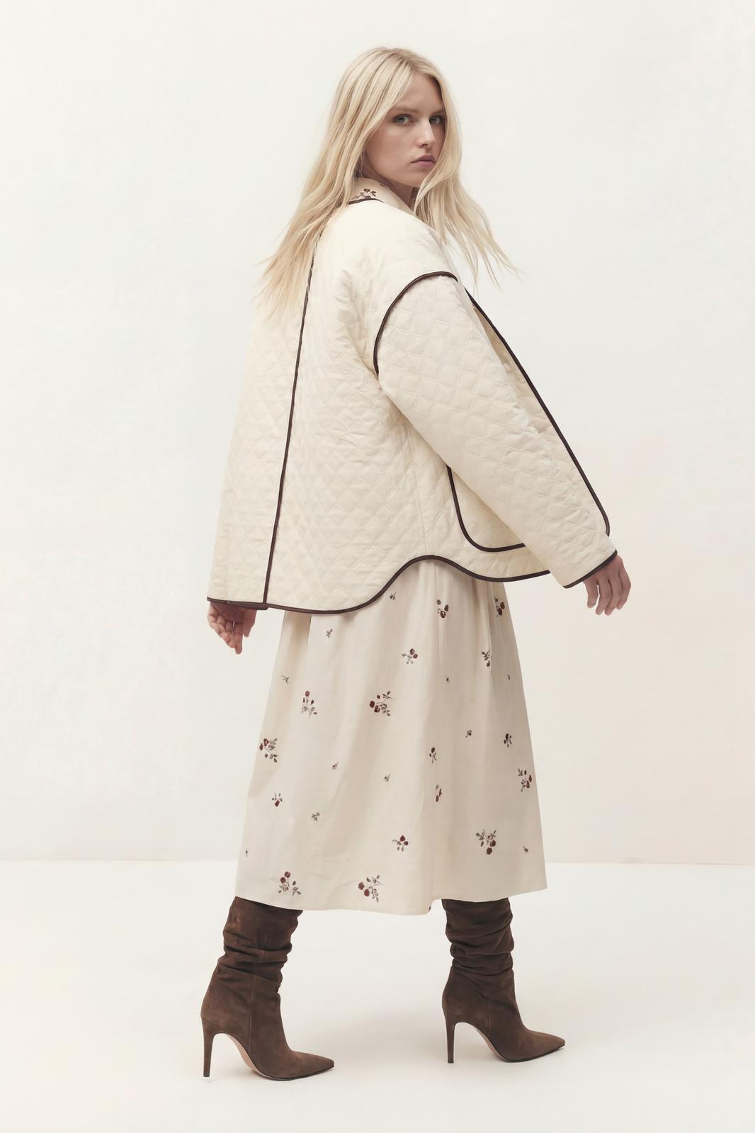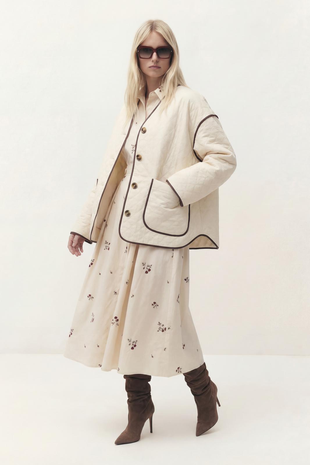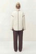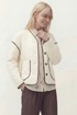 Куртка свободного кроя, облегченная, без подкладки и синтепона. Линия плеча спущена, рукав длинный. V-образный вырез горловины. Застежка однобортная на петли и пуговицы. По бокам накладные карманы. По спинке средний шов. Шов втачивания рукава, низ рукава, горловина, борт, карман, средний шов спинки обработан окантовкой из отделочной ткани.