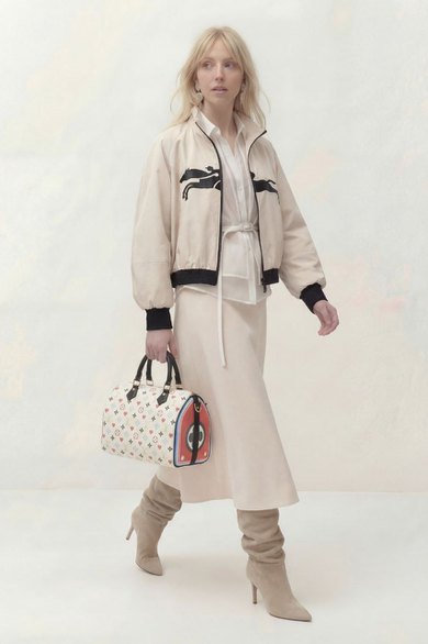 Куртка свободного силуэта из экокожи, на подкладке. Рукав реглан 3/4, объёмный с подрезом в области локтя, низ у рукава сосборен на эластичную тесьму. По горловине воротник стойка, застёжка на молнию. По переду аппликативная вышивка из экокожи, низ куртки сосборен на эластичную тесьму.