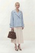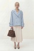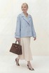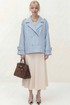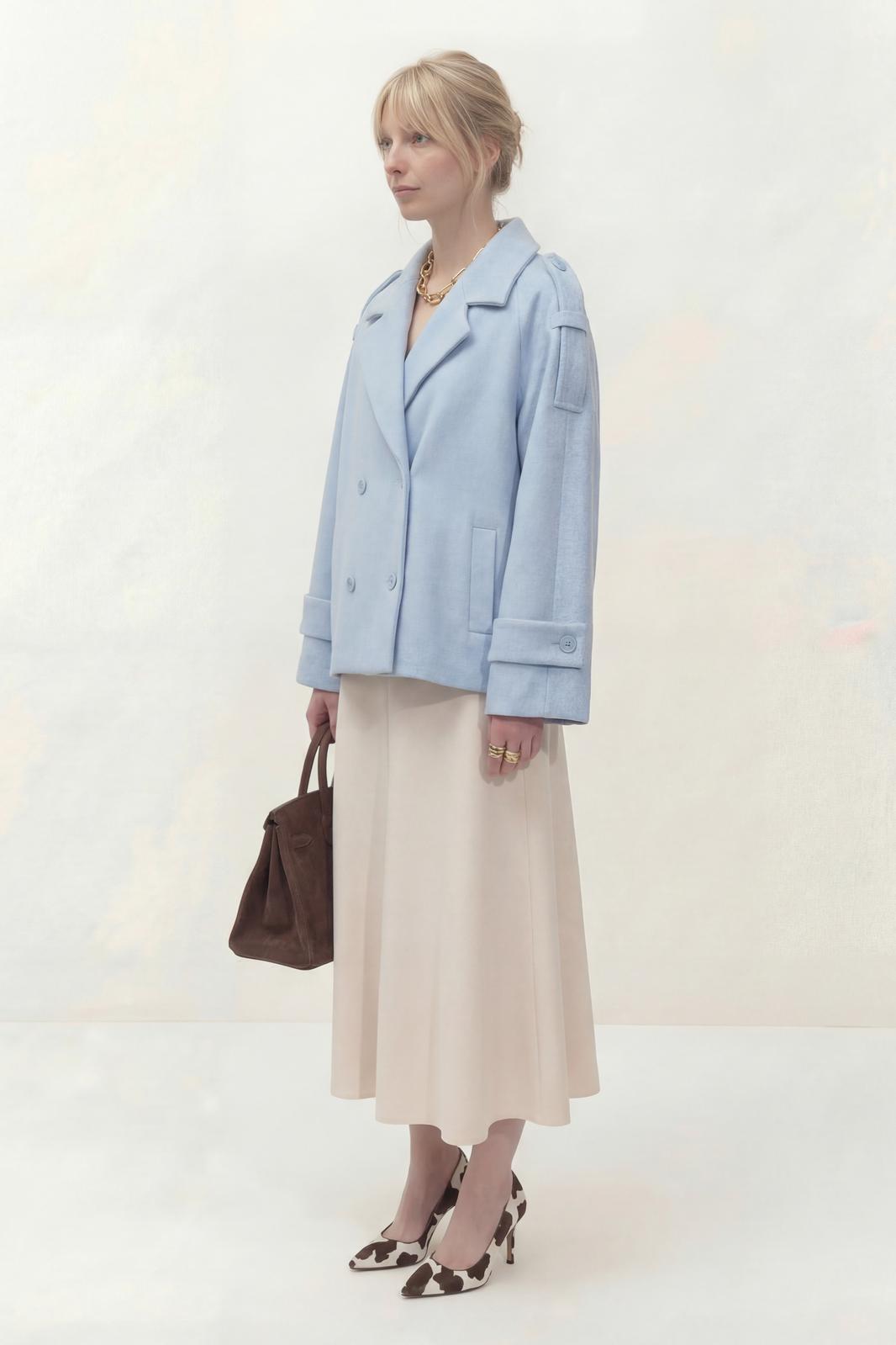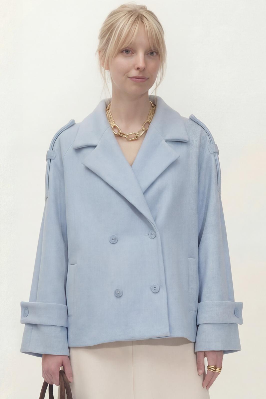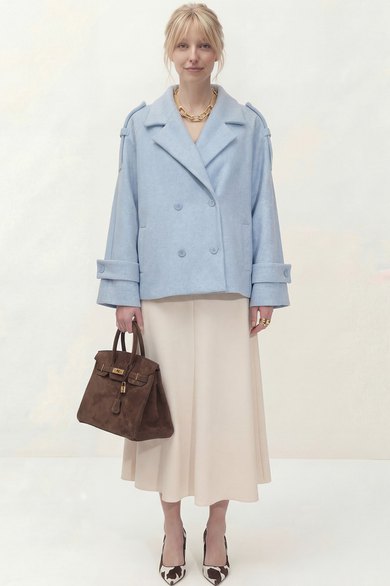 Укороченное двубортное пальто свободного кроя. Широкий английский воротник с заостренными лацканами. Застежка на два ряда пуговиц. Рукав реглан на манжете с пуговицой. На плечах элементы напоминающие погоны.
