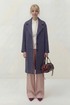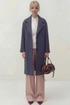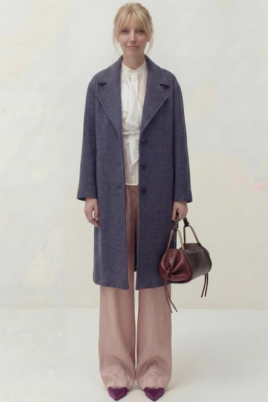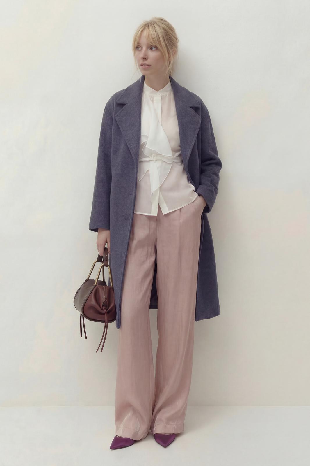 Пальто свободного кроя на подкладке. Линия плеча спущена, рукав длинный. Воротник пиджачного типа, застежка центральная на петли и пуговицы, в боковых швах карманы.