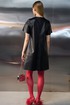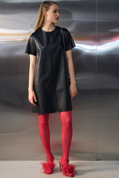 Платье А силуэта выполнено из экокожи, на подкладке. Рукав втачной короткий, округлый вырез горловины. По переду центральный шов и нагрудные вытачки. Застежка на потайную молнию в среднем шве спинки. Центральные, боковые швы и горловина декорированы металлическими зажимами.