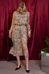 Платье свободного силуэта выполнено из плательной ткани с анималистическим принтом леопард. Рукав втачной, по низу рукава манжеты на застёжку петлю и пуговицу. Воротник рубашечного кроя, застёжка до линии талии на петли и пуговицы, по лифу клапаны выше линии груди клапаны. Линия талии отрезная на резинке. По переду юбки два глубоких запаха, которые фиксируются навесными петли и пуговицами. По лифу спинки кокетка и отрезная линия талии. К платью прилагается съёмный пояс из основной ткани, на резинке, с металлической пряжкой.
