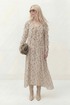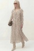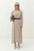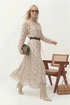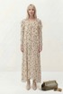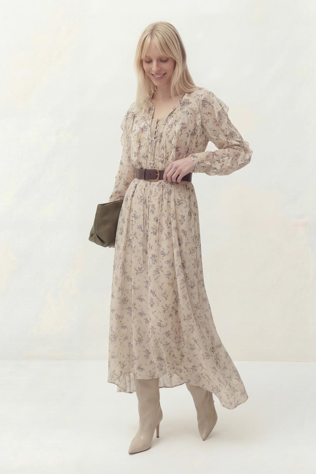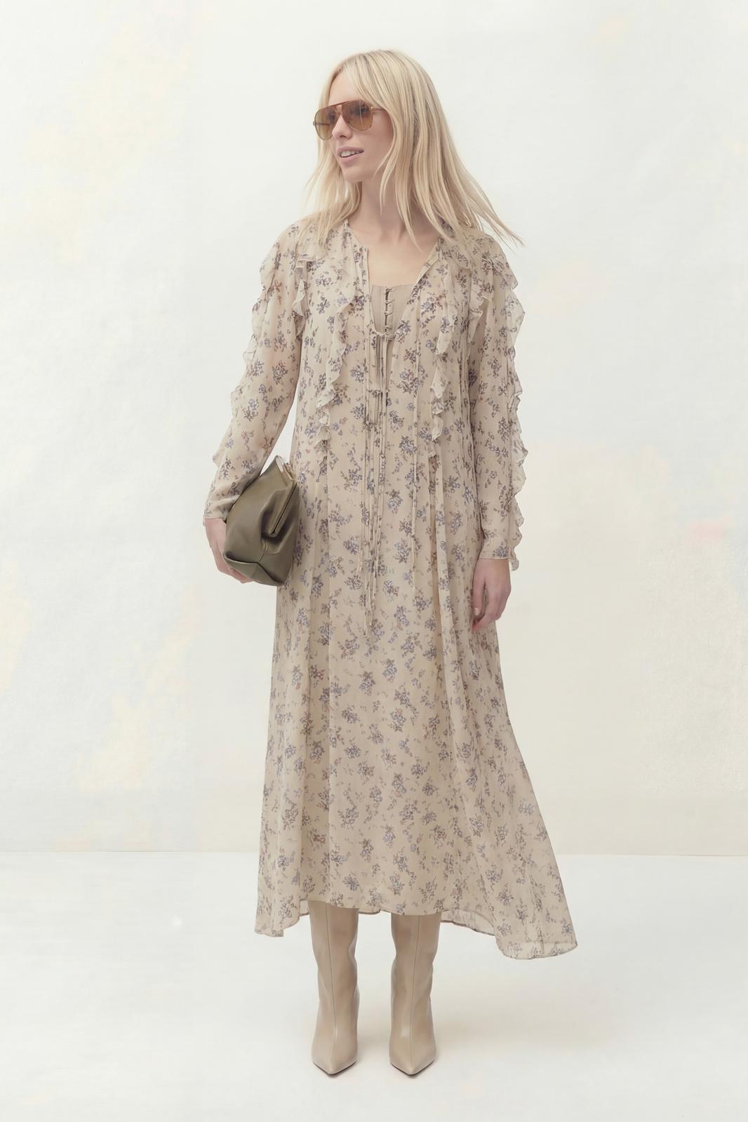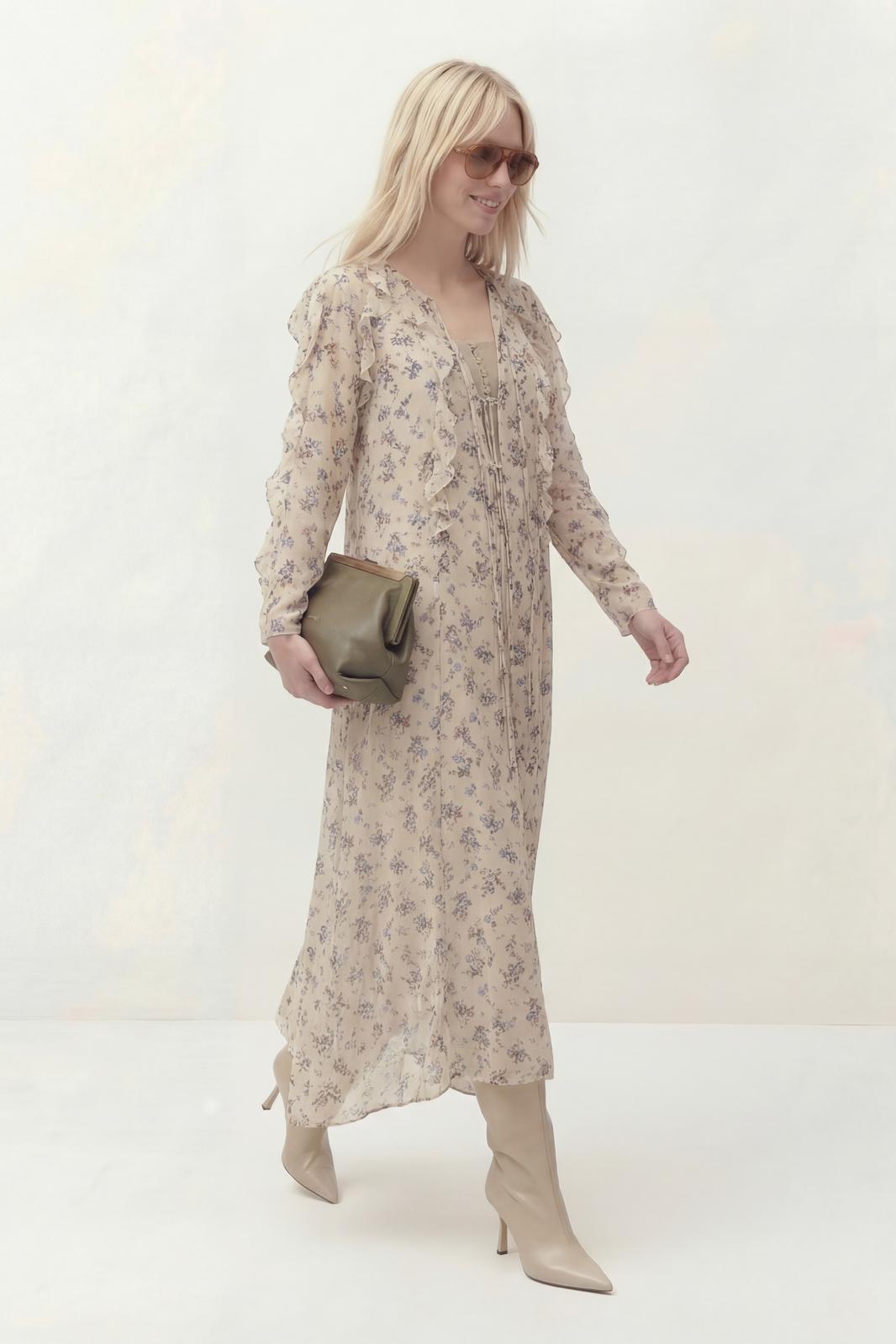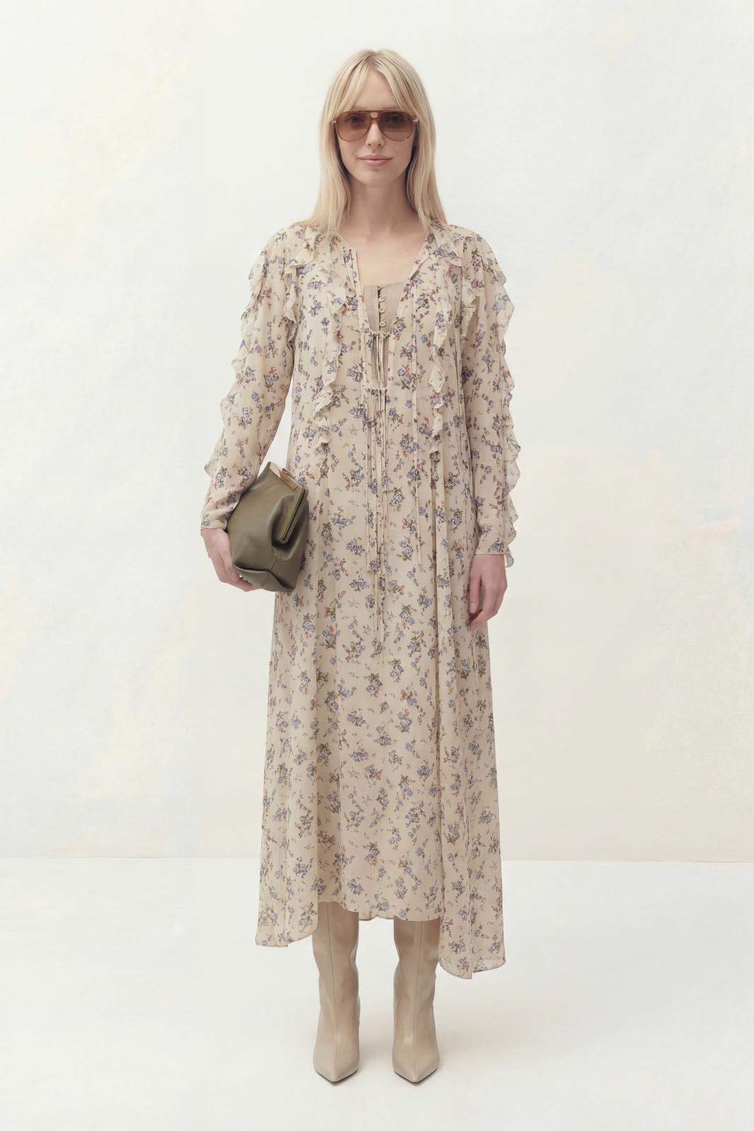 Платье свободного двухслойное. Верхний слой платья выполнен из шифона. Рукав длинный, кроя реглан, по переднему шву и пройме вставлена рюша. Округлый вырез горловины с глубоким разрезом до линии талии. Застежка по горловине и середине разреза – завязка из основной ткани. Нижний слой – платье-комбинация, которое выполнено из тонкой вискозной ткани. Комбинация на бретелях, по центру переда – разрез. На спинке застежка на навесные петли и пуговицы.