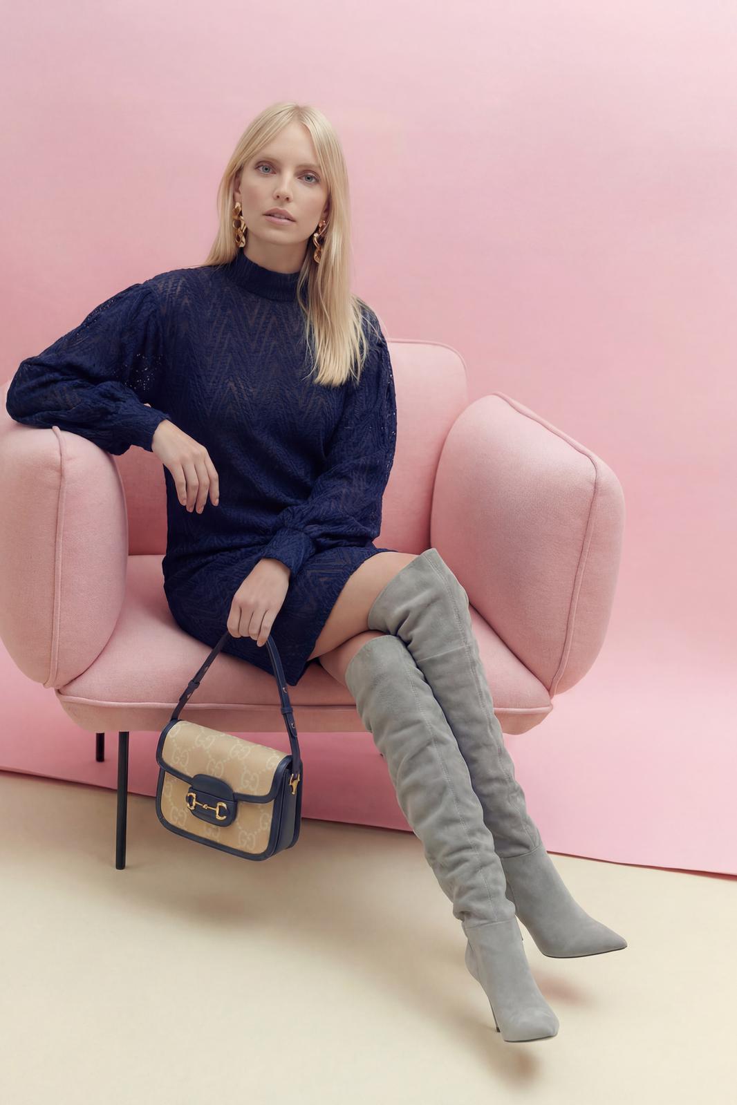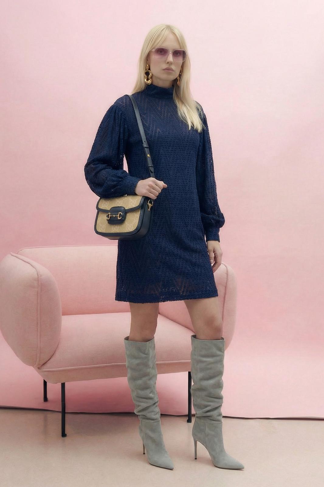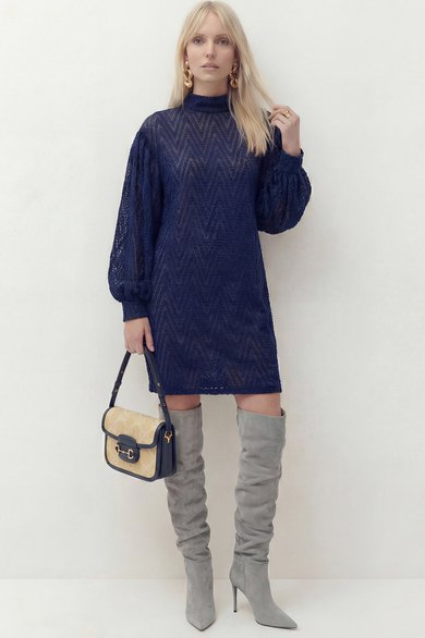 Платье силуэта «кокон». Имеет спущенную линию плеча, рукав длинный со сборкой по плечу и с манжетой по низу. В среднем шве спинки застежка на навесные петли-пуговицы. Воротник-стойка. Имеет второе платье-комбинацию на бретелях.