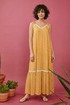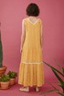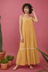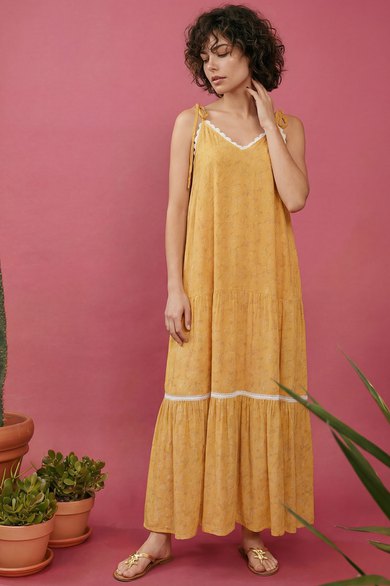 Платье-сарафан свободного кроя из тонкой льняной ткани в бело-голубом цвете. Хлопковая подкладка до нижнего подреза, по плечам бретели на завязку. По переду и спинке фигурный вырез горловины, обработанный кружевной тесьмой, которая плавно переходит в боковой шов. К лифу пришиты воланы на сборку. Между нижними воланами вшита кружевная тесьма.