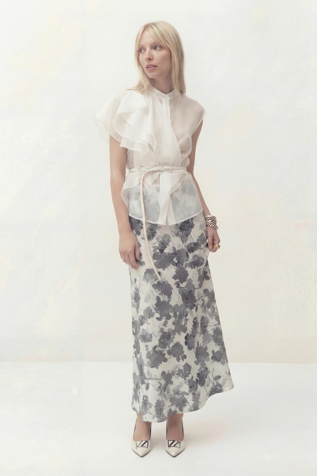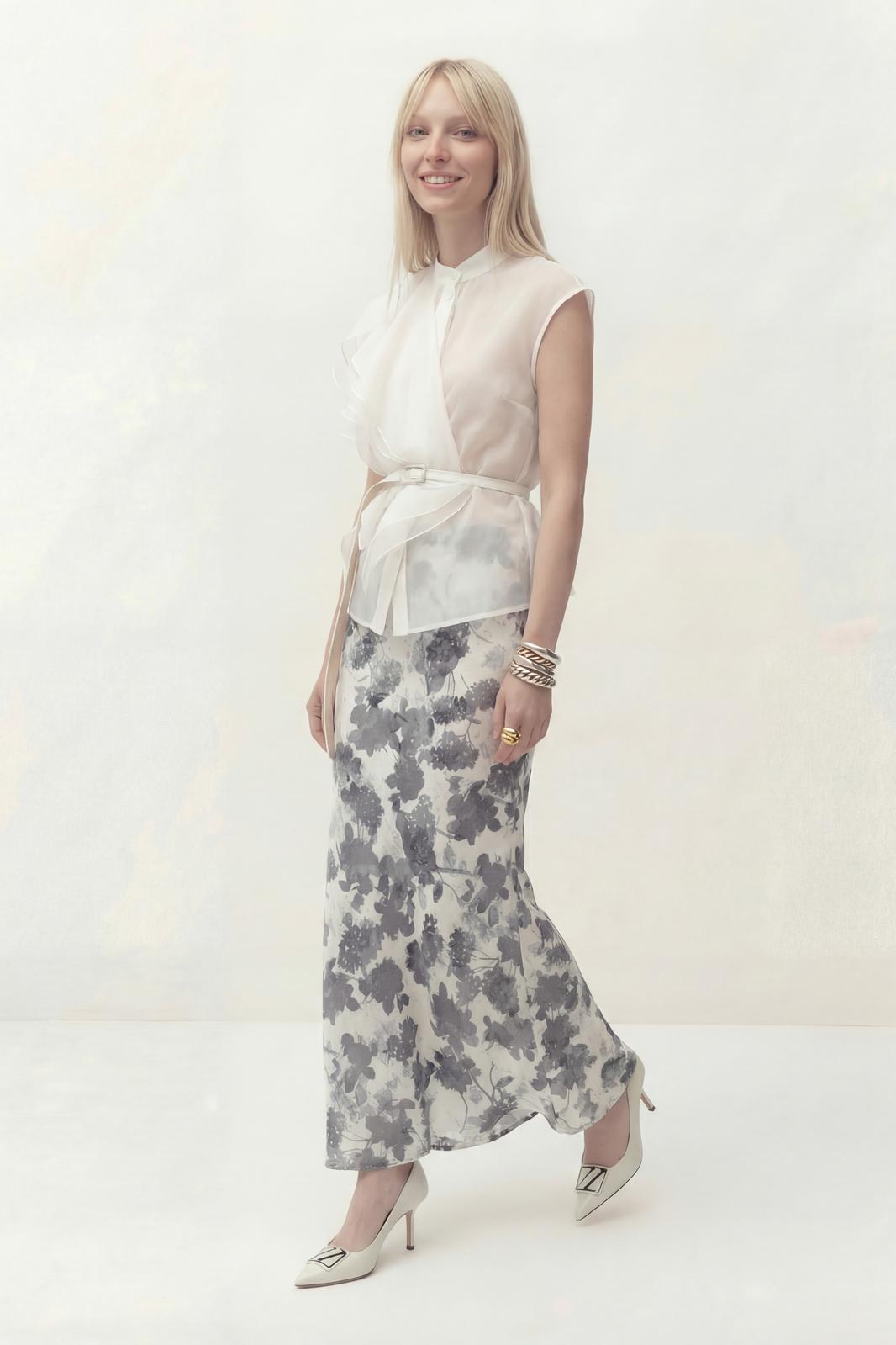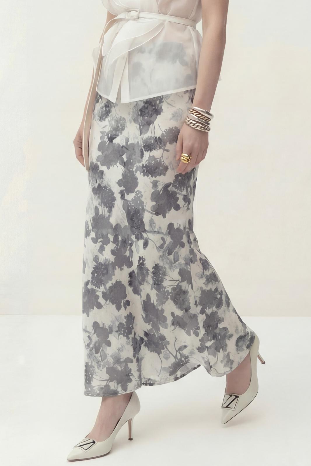 Юбка А-силуэта, выполнена из атласа на подкладке. Дизайн акварельные цветы. По талии на обтачке, застежка в боковом шве.